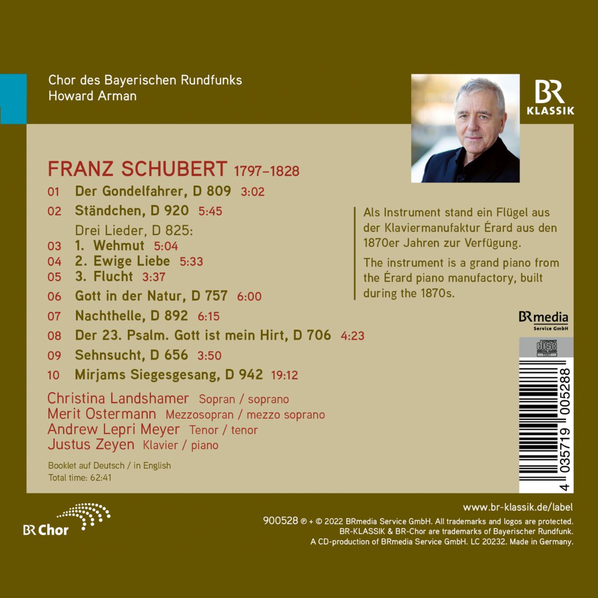 In der Gesellschaftsmusik, zu der ein Großteil von Franz Schuberts Liedschaffen zu zählen ist, kamen um 1800 mehrstimmige Vokalkompositionen als Teil der bürgerlichen Musikkultur und des gemeinschaftlichen Singens groß in Mode. Einige der bekanntesten Lieder Schuberts für Männer- respektive Frauenchor mit Klavier sind in der vorliegenden „Schubertiade“ zusammengefasst. Christina Landshamer, Merit Ostermann und Andrew Lepri Meyer, der Chor des Bayerischen Rundfunks unter Leitung von Howard Arman sowie mit Justus Zeyen am historische Érard-Flügel sorgen für Klasse und Authentizität.