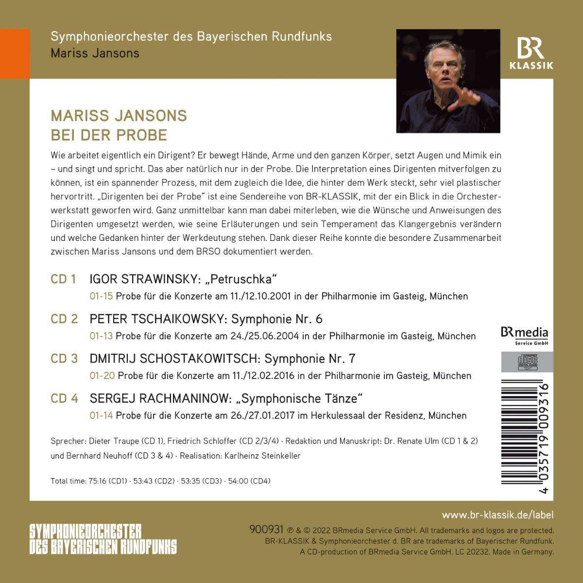 Wie viel Arbeit im Einstudieren eines Werkes steckt, wie viel Mühe und Detailarbeit Orchesterleiter und Klangkörper aufbringen, bleibt üblicherweise verborgen. Die kommentierte Sendereihe „Dirigenten bei der Probe“ bei BR-Klassik beleuchtet genau diesen Prozess: Wie entsteht eine Interpretation? Bei der vorliegenden 4-CD-Box erlebt man Mariss Jansons, wie er „seinem“ BRSO seine musikalischen Vorstellungen vermittelt: Erklärend, singend, lobend, korrigierend, doch stets mit größtem Respekt. Das Jansons’sche Kernrepertoire mit Rachmaninow, Schostakowitsch, Strawinsky und Tschaikowsky in der Orchesterwerkstatt nimmt langsam Form an.