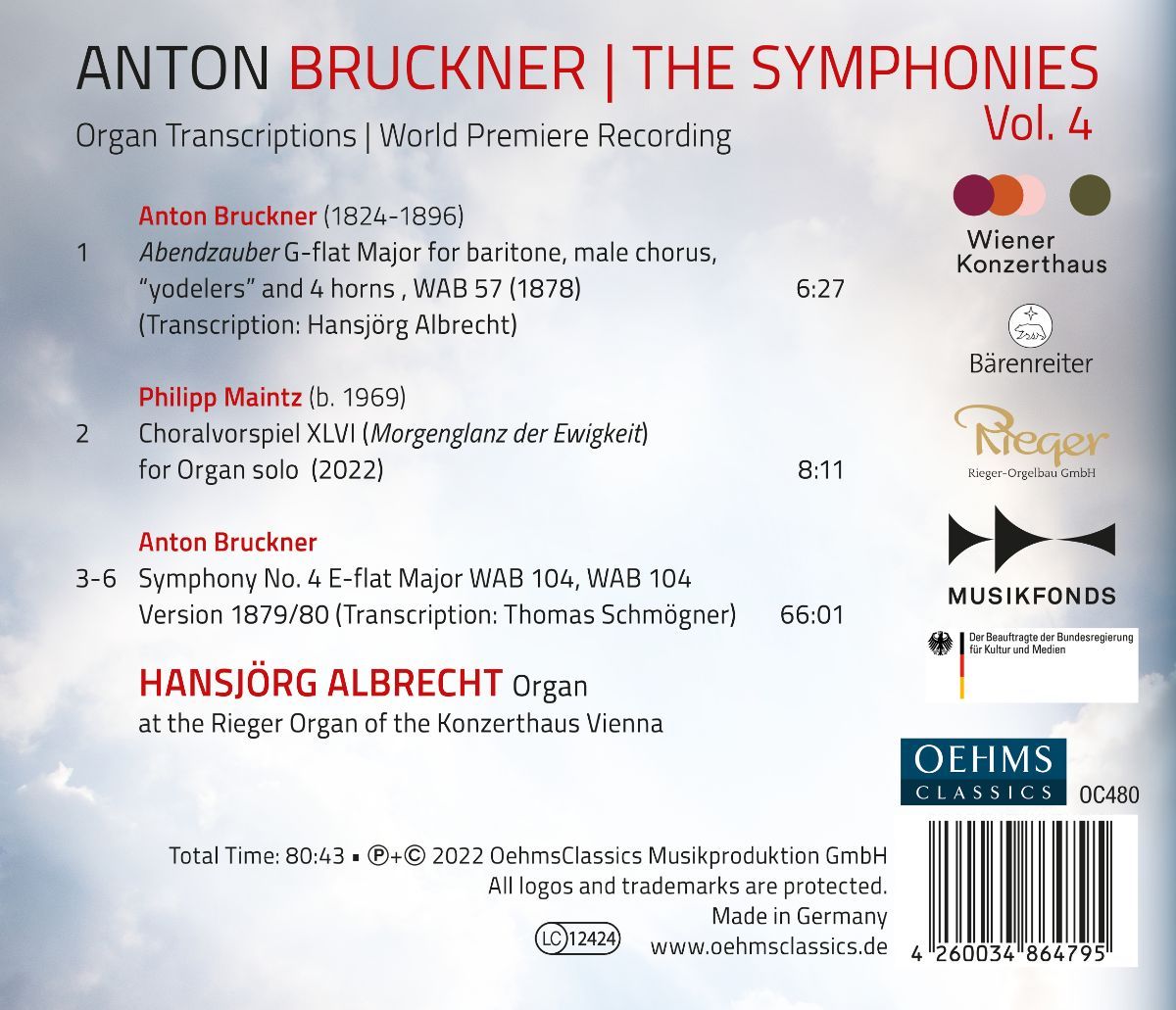 In der Reihe „Anton Bruckner Project: The Symphonies“ widmet sich der Organist Hansjörg Albrecht anlässlich des kommenden 200. Geburtstag von Anton Bruckner (im Jahre 2024) dem sinfonischen Werk des Komponisten auf originelle Weise: Er spielt in vornehmlich neuen Orgel-Transkriptionen den vollständigen Sinfonien-Zyklus ein. Volume 4 entstand an der berühmten Orgel des Wiener Konzerthauses und präsentiert Bruckners wohl populärste (vierte) Sinfonie, die „Romantische“ in Es-Dur in der bekannten Bearbeitung des Wiener Organisten Thomas Schmögner.