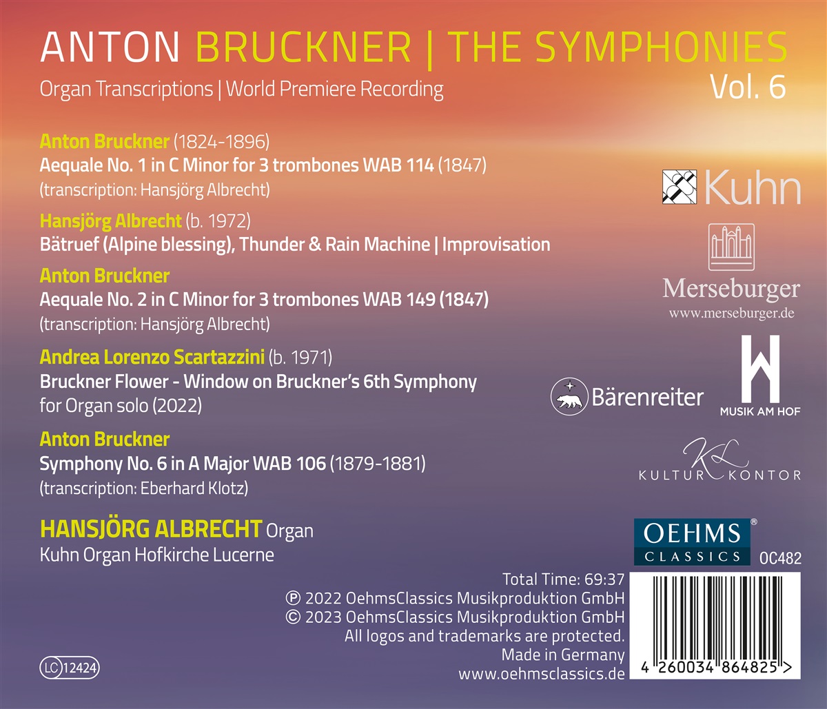 Hansjörg Albrecht hat sich zum nahenden 200. Geburtstags Anton Bruckners etwas Besonderes einfallen lassen: Werk für Werk spielt er sämtliche Sinfonien in zumeist neuen Transkriptionen für Orgel ein, angefangen mit der „Nullten“ (Vol. 0). Die siebte Veröffentlichung enthält Bruckners Sechste in der Transkription von Eberhard Klotz. Sie wird auf der Orgel der Hofkirche Luzern gespielt. Darüber hinaus enthält das Album drei Transkription von Hansjörg Albrecht höchstselbst: die Aequale Nr. 1, WAB 114 und Nr. 2 WAV 149 (ursprünglich für drei Posaunen) und der „Bätruef, Donner & Regenmaschine“ von 1862. Als zeitgenössisches „Bruckner-Fenster“ enthält das Album das Werk „Brucknerblume“ des italienischen Komponisten Andrea Lorenzo Scartazzini.