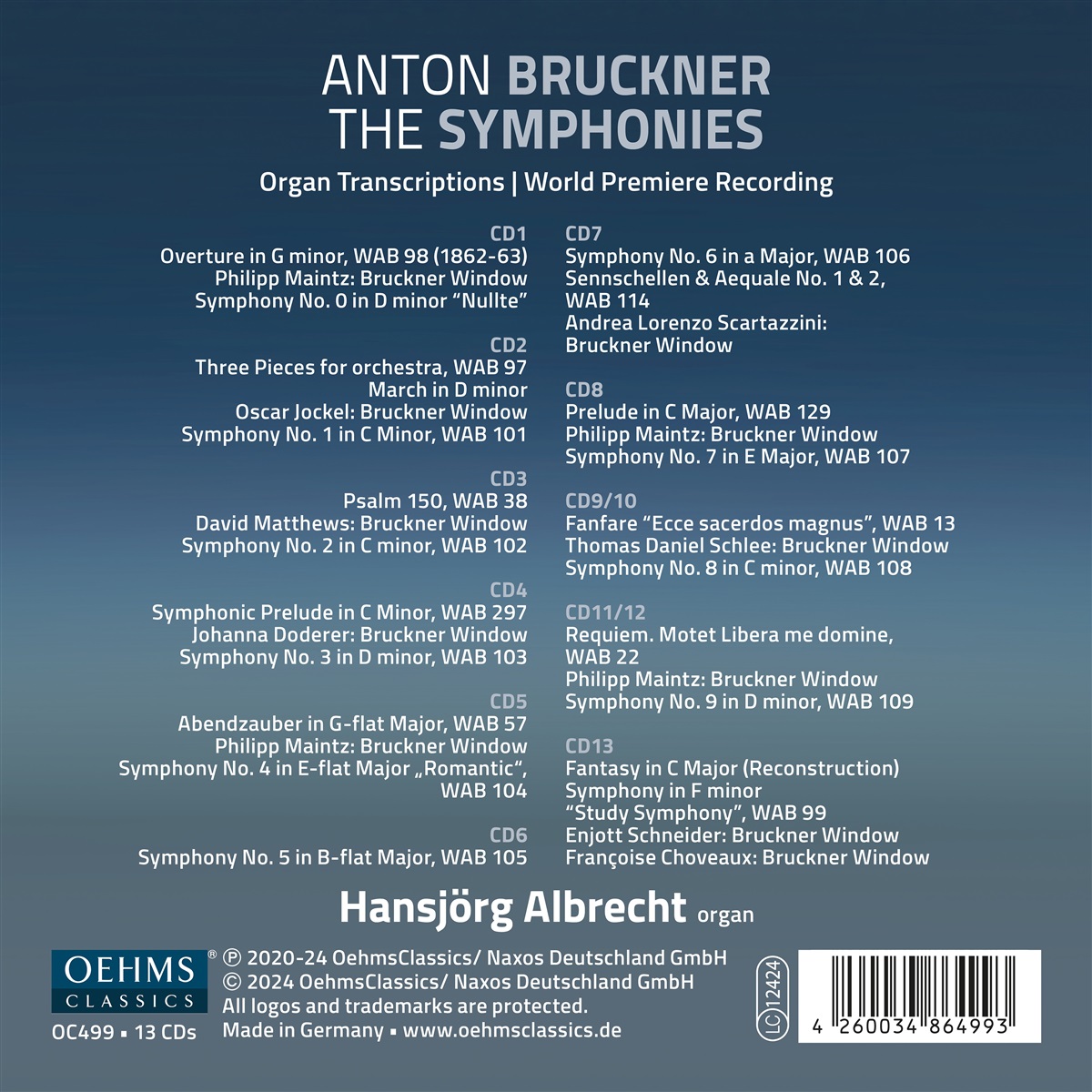 Es ist vollbracht: Nahezu drei Jahre nach der Veröffentlichung des ersten Albums dieser einzigartigen Gesamteinspielung der Bruckner-Sinfonien in aktuellen, nicht selten ersteingespielten Orgeltranskriptionen, markiert die Veröffentlichung der Gesamtbox mit 13 Disks einen würdigen Abschluss. Sie enthält Bruckners Sinfonien 0-9, plus, als Premiere, die frühe Sinfonie in f-Moll (die sogenannte „Studiensymphonie“) in einer Transkription von Eberhard Klotz. Die Reihe verbindet die Bruckner-Tradition mit der Gegenwart, in der sie den Sinfonien jeweils ein sogenanntes „Bruckner-Fenster“, gegenüberstellt. Und so ist diese Reihe nicht nur eine Zusammenfassung aktueller Bruckner-Bearbeitungen, sondern auch ein Einblick in die aktuelle Orgelmusik und ihre Komponisten.