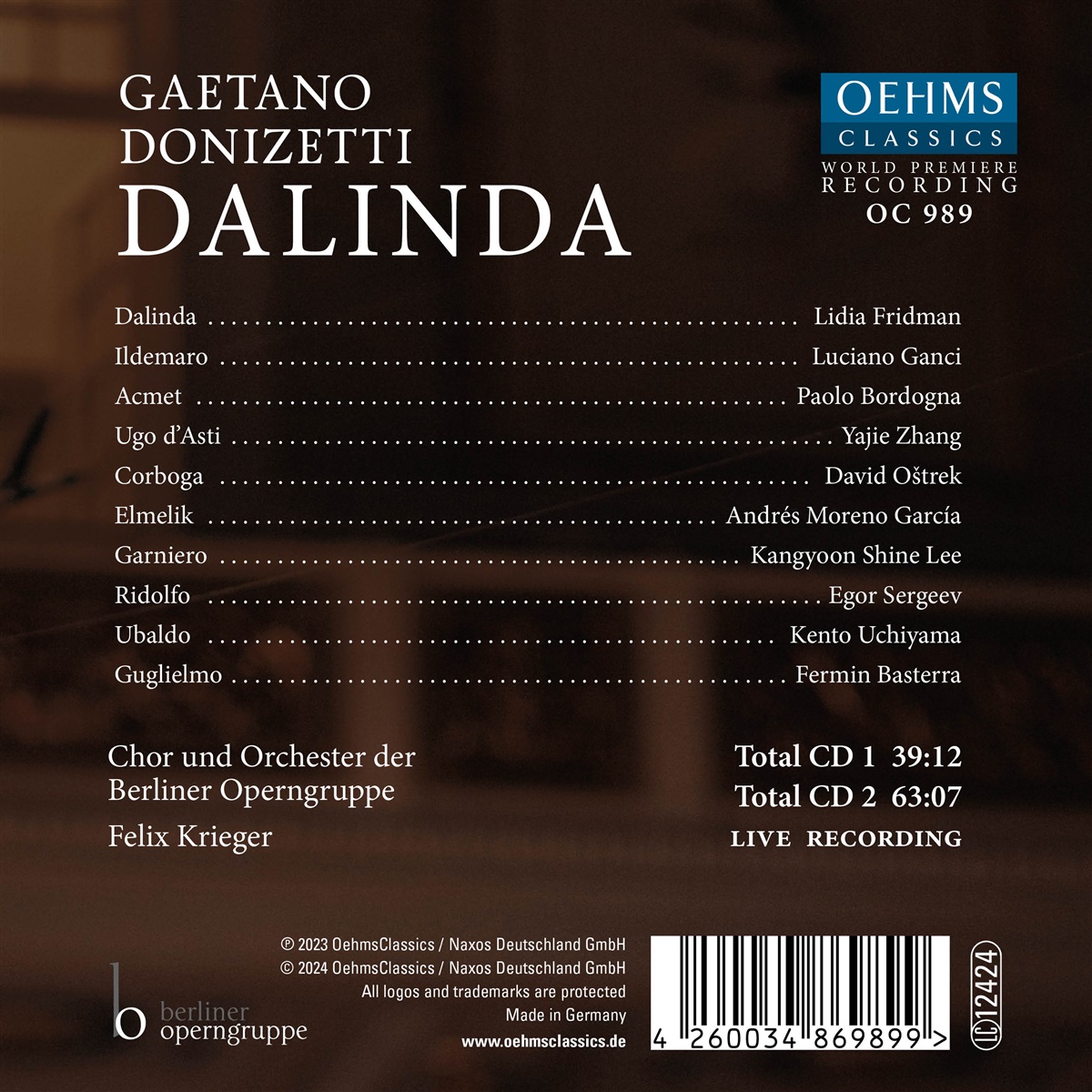 Die Berliner Operngruppe hat sich seit Ihrem Bestehen 2013 mit (Berliner) Erstaufführungen wie Donizettis „Deux Hommes et une Femme“, Mascagnis „Iris“ und weiteren Opern-Raritäten einen Namen gemacht. Dieses Album ist ein Mitschnitt der Uraufführung von Donizettis Oper „Dalinda“, also jener Oper, die aus den Zensur- und Plagiatswirren um die „Lucrezia Borgia“ 1838 entstand, der Zensur jedoch ebenso wenig standhielt und unaufgeführt verschwand, bis sie vor wenigen Jahren von der Musikwissenschaftlerin Eleonora Di Cintio gefunden und rekonstruiert wurde: ein Sensationsfund für alle Belcanto-Fans.