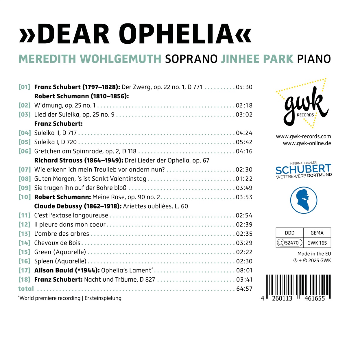 „Dear Ophelia” ist eine Reise zu den inneren Stimmen, die wir Menschen in uns tragen. Mit Shakespeares Ophelia (Hamlet), einer der interessantesten und wirkungsmächtigsten Frauenfiguren der europäischen Kulturgeschichte, erkunden die Sopranistin Meredith Wohlgemuth und die Pianistin Jinhee Park in ihrem Debut-Album die emotionalen Landschaften, die uns über Zeiten und Kulturen hinweg verbinden. „Ophelias Geschichte, erfüllt von Verletzlichkeit und Stille, hat uns beiden geholfen, etwas sehr Persönliches und Essentielles in uns aufzuschließen, und in ihr haben wir Echos unserer selbst gefunden. Im Kern geht es in diesem Album um Beziehung und Verbundenheit zwischen Menschen, über die Zeit hinweg und durch Musik, um die innere Wahrheit des Menschseins”, bekennen die beiden im Booklet. Wohlgemuth und Park, die 2023 den 1. Preis beim Internationalen Schubert-LiedDuo-Wettbewerb Dortmund sowie 2022 den 1. Preis des Concours musical international de Montreal gewannen, machen ihre Reise mit ausgewählten Liedern von Franz Schubert („Der Zwerg“, „Suleika I“ und „Il“, „Gretchen am Spinnrade“, „Nacht und Träume“), Robert Schumann („Widmung“, „Lied der Suleika“, „Meine Rose“), den „Drei Liedern der Ophelia“ von Richard Strauss, Claude Debussys „Ariettes oubliees“ sowie der Ersteinspielung des szenischen Liedes „Ophelia’s Lament“ der australisch-englischen Komponistin Alison Bauld (*1944).