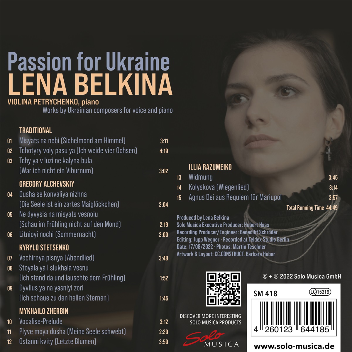 Die UNESCO hat eine beeindruckende Phono-Bibliothek mit Volksliedern aus aller Welt zusammengestellt. Der Anteil der Ukraine mit rund 15.500 Titel ist darin so groß wie kein zweiter. Der Grundstamm des ukrainischen Volksliedschatzes entstand im 9. Jahrhundert. Die Lieder wurden immer wieder von Komponisten aufgegriffen, so auch in den vorliegenden Lied-Romanzen für Gesang und Klavier. Das hier zusammengefasste Programm enthält 15 Lieder: drei Romanzen von vier Komponisten und drei Volkslieder. Jedes Werk hat den Lebensweg der ukrainischen Mezzosopranistin Lena Belkina begleitet. Die Pianistin Violina Petrychenko ist ihr dabei eine kompetente und engagierte Begleiterin.