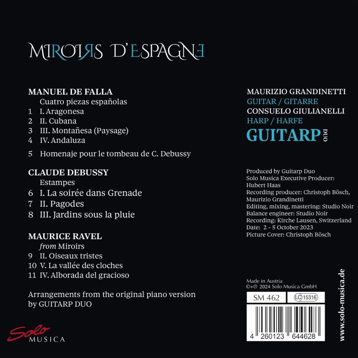 In den Biografien und in der Musik von Claude Debussy, Maurice Ravel und Manuel de Falla sind viele Spiegelungen verborgen, Elemente, die sich gegenseitig reflektieren. Diese Spiegelungen sind so stark, dass es in vielen Fällen schwierig ist, das ursprüngliche Bild zu erkennen. Die iberisch inspirierte Musik und das Klavier als Instrument waren sicherlich gemeinsame Bereiche, auf denen ein reger künstlerischer Austausch der drei Komponisten stattfand. Das romantische Klavierrepertoire hat sich Musik unterschiedlichster Herkunft angeeignet. Führt man diese auf das Instrument zurück, durch welches sie ursprünglich inspiriert wurde, werden wir gleichsam Zeugen einer Art von Klangregeneration und nicht der einer Transkription, so als würde die Musik in ihrer reinen Form wiedergeboren. In den auf diesem Album enthaltenen Werken stehen Gitarre, Harfe und Klavier in einer solch komplementären Beziehung. So hat etwa Maurice Ravel dem Pianisten Vlado Perlemuter eigenhändig in dessen Partitur der „Miroirs“ notiert, er solle bei gewissen Passagen die Gitarre oder auch die Harfe imitieren. De Falla wiederum sagt in seinem Artikel „La guitara“, dass Debussy in wunderbarer Weise die künstlerischen Qualitäten des Instrumentes in seinen Werken darstellte, ohne sie je in seinen Kompositionen verwendet zu haben. Viele Pianisten jener Zeit, genährt von der romantischen Tradition, hatten oft Mühe der neuen musikalischen Bildsprache des Symbolismus gerecht zu werden. Die Chroniken der Zeit offenbaren eine gewisse Ungeduld der Komponisten, die von den Pianisten eine neue Technik und einen anderen Gebrauch des Pedals forderten. Im Gegensatz zum Klavier bieten Gitarre und Harfe weniger definierte, eher weiche Konturen, passend zu den melancholischen und mehrdeutigen Klangfarben der Musik von Debussy und Ravel.