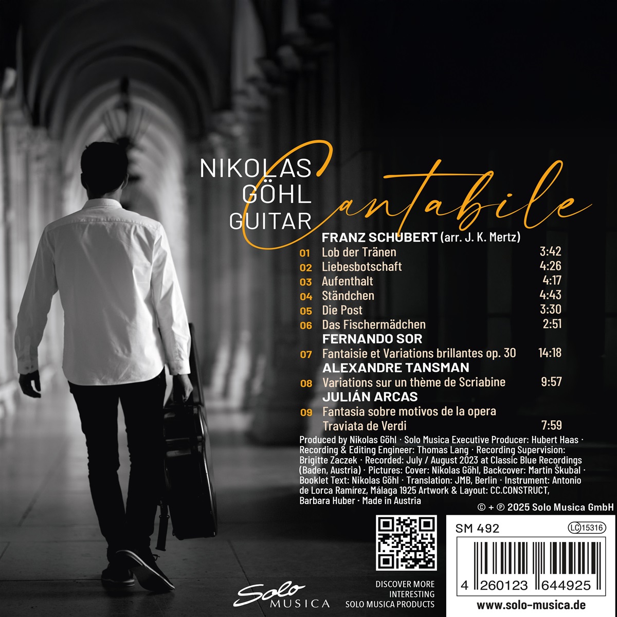 Alle auf dieser CD eingespielten Werke sind entweder Arrangements von Gesangsliteratur, oder in ihrer Komposition gesanglich inspiriert. Die Stücke stehen teils zeitgeschichtlich, teils stilistisch in engem Zusammenhang zur Epoche der Romantik, in der die Gesanglichkeit ein wesentliches Ziel des musikalischen Ausdrucks war. Alle Stücke wurden auf einer spanischen Gitarre eingespielt, die 1925 in Málaga von Antonio de Lorca Ramírez (1875-1929), Vertreter einer der bekanntesten Gitarrenbauerdynastien, gebaut wurde. Somit feiert das Instrument im Entstehungsjahr dieser CD seinen 100. Geburtstag. Den ersten Gitarrenunterricht erhielt Nikolas Göhl (*1991 in Naila, Deutschland) im Alter von fünf Jahren beim Gitarristen und Komponisten Dietmar Ungerank, der ihn bis zum Studium musikalisch förderte. Es folgte ein Studium bei Univ.-Prof.in Brigitte Zaczek an der Universität für Musik und darstellende Kunst Wien (mdw), welches er 2018 mit Auszeichnung abschloss. Daneben absolvierte er Meisterklassen bei bedeutenden Musikern wie Alvaro Pierri, Leo Brouwer, Odair Assad, Judicael Perroy, Lukasz Kuropaczewski und David Russell. In kammermusikalischen Besetzungen gibt er wiederholt Konzerte in Österreich, Deutschland, Tschechien, Italien, Ungarn, Rumänien, England und Litauen.