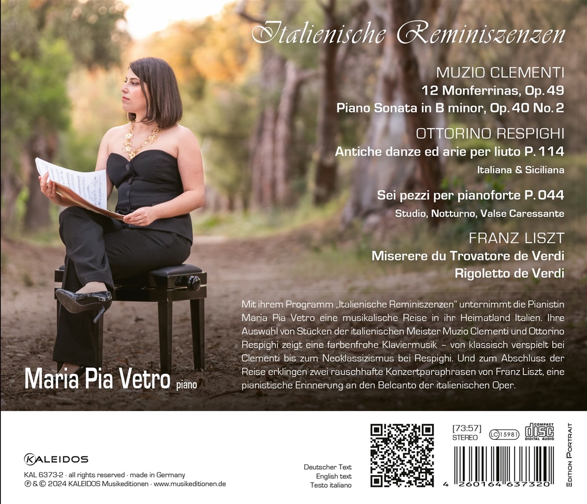 Mit ihrem Programm „Italienische Reminiszenzen“ unternimmt die Pianistin Maria Pia Vetro eine musikalische Reise in ihr Heimatland Italien. Ihre Auswahl von Stücken der italienischen Meister Muzio Clementi und Ottorino Respighi zeigt eine farbenfrohe Klaviermusik – von klassisch ver-spielt bei Clementi bis zum Neoklassizismus bei Respighi. Und zum Abschluss der Reise erklingen zwei rauschhafte Konzertparaphrasen von Franz Liszt, eine pianistische Erinnerung an den Belcan-to der italienischen Oper.
