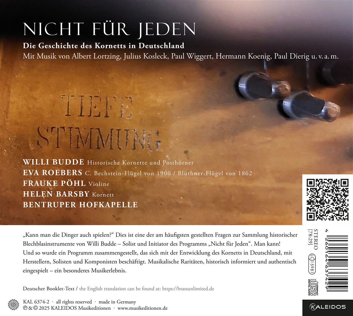 „Kann man die Dinger auch spielen?“ Dies ist eine der am häufigsten gestellten Fragen zur Sammlung historischer Blechblasinstrumente von Willi Budde – Solist und Initiator des Programms „Nicht für Jeden“. Man kann! Und so wurde ein Programm zusammengestellt, das sich mit der Entwicklung des Kornetts in Deutschland, mit Herstellern, Solisten und Komponisten beschäftigt. Musikalische Raritäten, historisch informiert und authentisch eingespielt – ein besonderes Musikerlebnis.