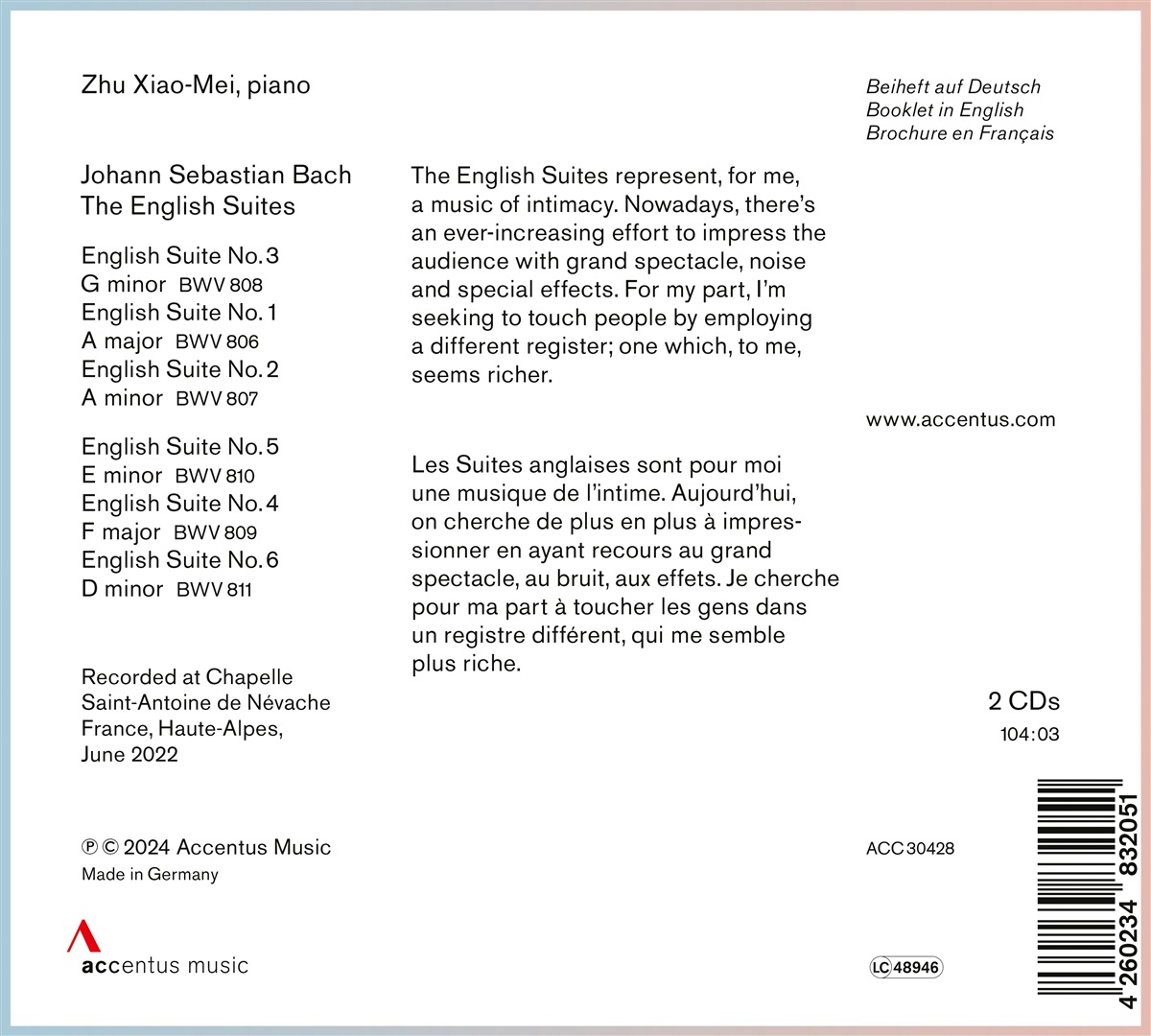 Nach einer sechsjährigen Pause kehrt die gefeierte Pianistin Zhu Xiao-Mei mit einer sehr persönlichen und meisterhaften Aufnahme der „Englischen Suiten“ von Johann Sebastian Bach zurück. Diese Veröffentlichung vervollständigt ihre gefühlvolle Reise durch Bachs Klavierkompositionen und stellt einen weiteren bedeutenden Meilenstein in ihrer außergewöhnlichen Karriere dar. Das Projekt ist das Ergebnis jahrelanger, akribischer Vorbereitung und einer innigen Beziehung zur Musik. Zhu Xiao-Meis Herangehensweise zeichnet sich durch eine tiefe Verbindung zu jedem Stück aus, die es ihr ermöglicht, die Feinheiten und Nuancen herauszuarbeiten, die Bachs Werk so zeitlos machen. Hingebungsvoll lebt sie Tag für Tag mit der Musik und erreicht somit eine Darbietung, die sowohl authentisch ist als auch tief nachhallt. Die "Englischen Suiten" mit ihrer Mischung aus lebhaften orchestralen und zarten intimen Momenten haben einen besonderen Platz in Zhu Xiao-Meis Herzen. Sie beschreibt sie als 'eine Musik der Intimität', was diese Aufnahme besonders einzigartig macht. Trotz verschiedener Herausforderungen, darunter pandemiebedingten Verzögerungen und die Suche nach dem perfekten Klavier, ist ihre Hingabe in jeder Note zu hören. Zhu Xiao-Meis einfühlsame und sensible Darbietung lädt in eine Welt voller Subtilität und Tiefe ein und bietet einen erfrischenden Kontrast zur heutigen schnelllebigen Musiklandschaft.