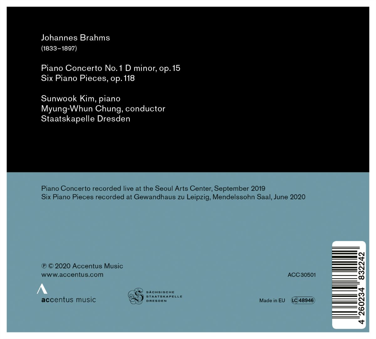 Der koreanische Stardirigent Myung-Whun Chung ist Kulturbotschafter seines Heimatlands Südkorea und widmet sich seit vielen Jahren der Förderung junger koreanischer Künstler. Seit der Pianist Sunwook Kim im Jahr 2006 mit nur 18 Jahren den prestigeträchtigen internationalen Klavierwettbewerb in Leeds gewann, pflegen er und Chung eine enge musikalische Partnerschaft. Sunwook Kim erhielt für seine bisherigen Solo-Einspielungen mit Klavierwerken von Beethoven, Brahms und Franck international hervorragende Kritiken. Der Komponist Johannes Brahms liegt dem Pianisten sehr am Herzen und so ist es kein Zufall, dass dessen Klavierkonzert Nr. 1 im Herbst 2019 Mittelpunkt von Kims Asientournee mit der Staatskapelle Dresden unter Chungs Leitung stand. Komplettiert wird die Veröffentlichung mit den „Sechs Klavierstücken“ op. 115.