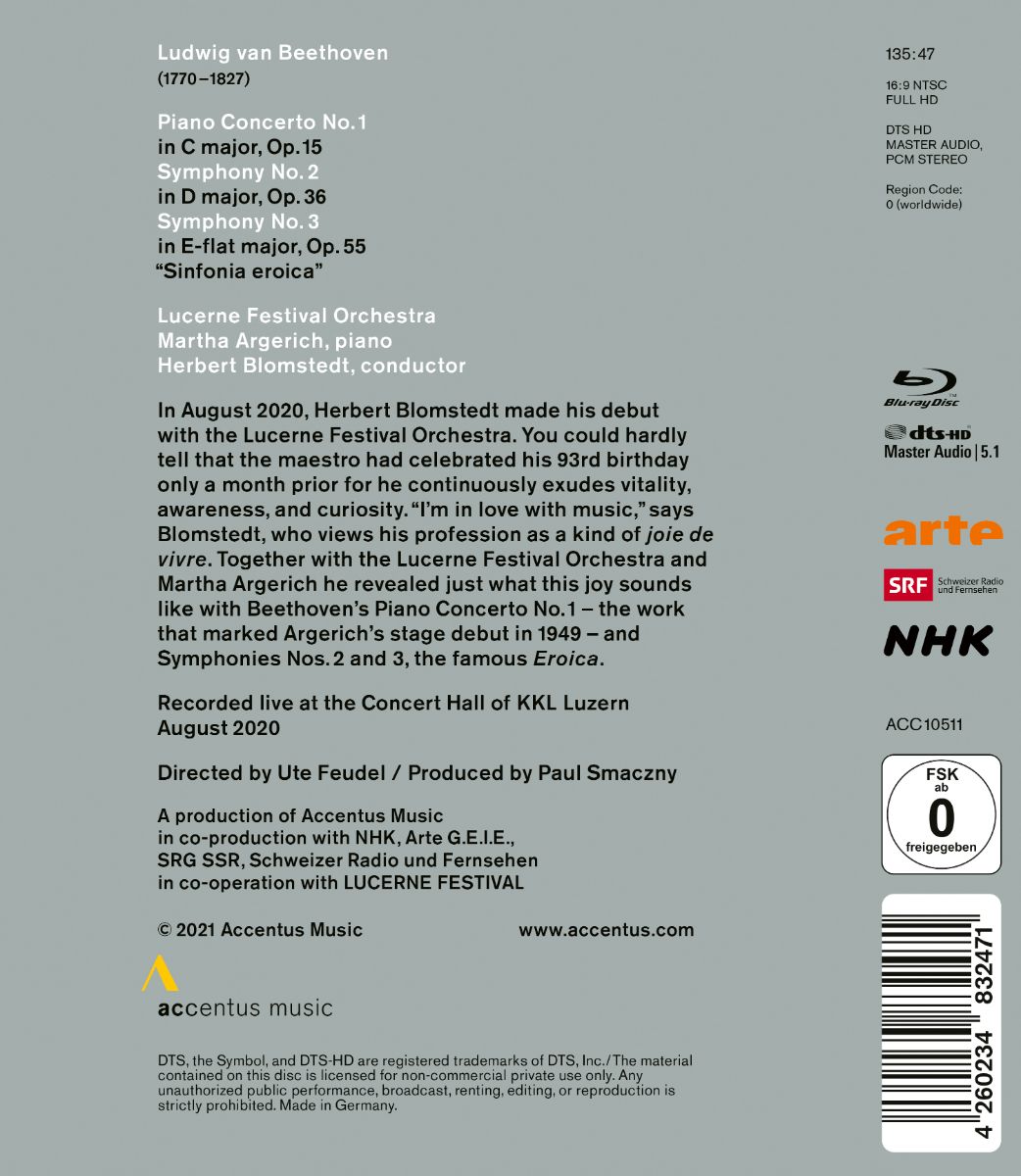 Im August 2020 gab Herbert Blomstedt sein Debüt mit dem Lucerne Festival Orchestra. Dass der Maestro erst einen Monat zuvor seinen 93. Geburtstag gefeiert hatte, merkt man ihm kaum an, denn er strahlt unentwegt Vitalität, Wachheit, Neugierde und Freude am Musizieren aus. Wie diese Freude klingt, zeigte er zusammen mit dem Lucerne Festival Orchestra und Martha Argerich mit Beethovens Klavierkonzert Nr. 1 – dem Werk, mit dem Argerich 1949 ihr Bühnendebüt gab – und den Sinfonien Nr. 2 und 3, der berühmten „Eroica“.