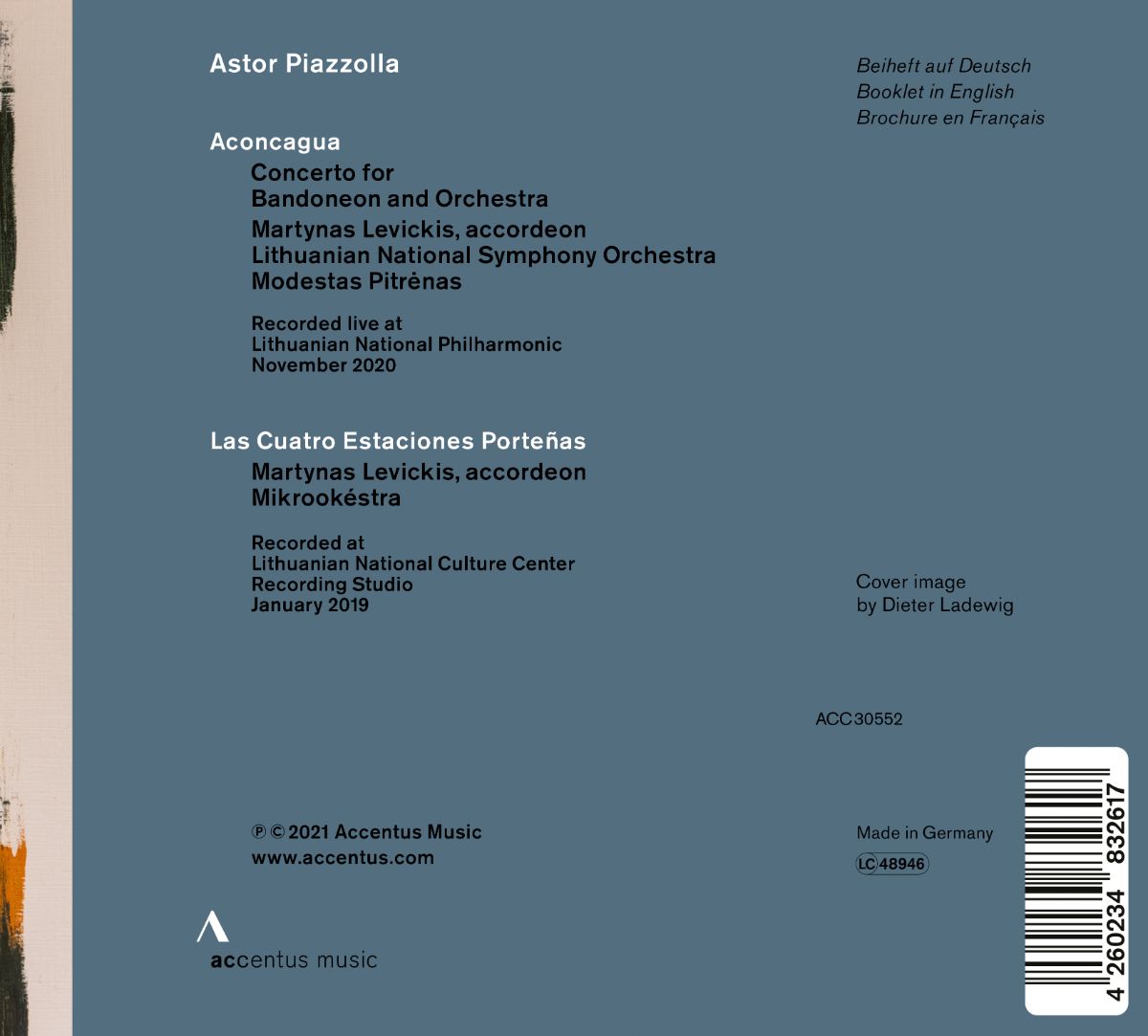 Piazzolla schrieb die vier Tango der „Cuatro Estaciones porteñas“ ursprünglich einzeln für sein eigenes Ensemble in der Besetzung Violine, Klavier, E-Gitarre, Kontrabass und Bandoneon. Ihre volle Wirkung entfalten die Stücke allerdings als „Konzert“ für Kammerorchester und Bandoneon. Der litauische Akkordeonist Martynas Levickis hat nun die „Vier Jahreszeiten“ aus Buenos Aires gemeinsam mit Piazzollas ‚echtem‘ Konzert für Bandoneon und Orchester „Aconcagua“ aufgenommen. Den Orchesterpart übernimmt auf dem Album das Lithuanian National Symphony Orchestra unter der Leitung von Modestas Pitrenas bzw. das Kammerensemble Mikrookéstra.