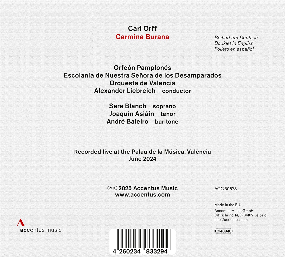 Carl Orffs „Carmina Burana“ gehört zu den bekanntesten und meistgespielten Werken der klassischen Musik. Der lateinische Titel bezieht sich auf eine Sammlung von Liedern aus Benediktbeuern aus dem 11. und 12. Jahrhundert mit Texten in Mittellatein, Altfranzösisch und Mittelhochdeutsch. Orff wählte 24 dieser Lieder aus, deren Themen von der Unbeständigkeit des Glücks bis zum Wohlstand reichen, von der Vergänglichkeit des Lebens über die Freude über die Rückkehr des Frühlings bis hin zu den Freuden und Gefahren von Trunkenheit, Völlerei, Glücksspiel und Wollust. Im Juni 2024 führte das Orquestra de València, eines der großen spanischen Sinfonieorchester, zusammen mit dem führenden örtlichen Knabenchor sowie einem der ältesten Chöre Spaniens, dem Orfeón Pamplonés, dieses epische Werk unter der musikalischen Leitung von Alexander Liebreich im Palau de la Música in València auf. Sie wurden von den Solisten Sara Blanch, Joaquín Asiáin und André Baleiro begleitet. Die Live-Aufnahme dieses lebhaften und fesselnden Konzertabends ist jetzt erhältlich.