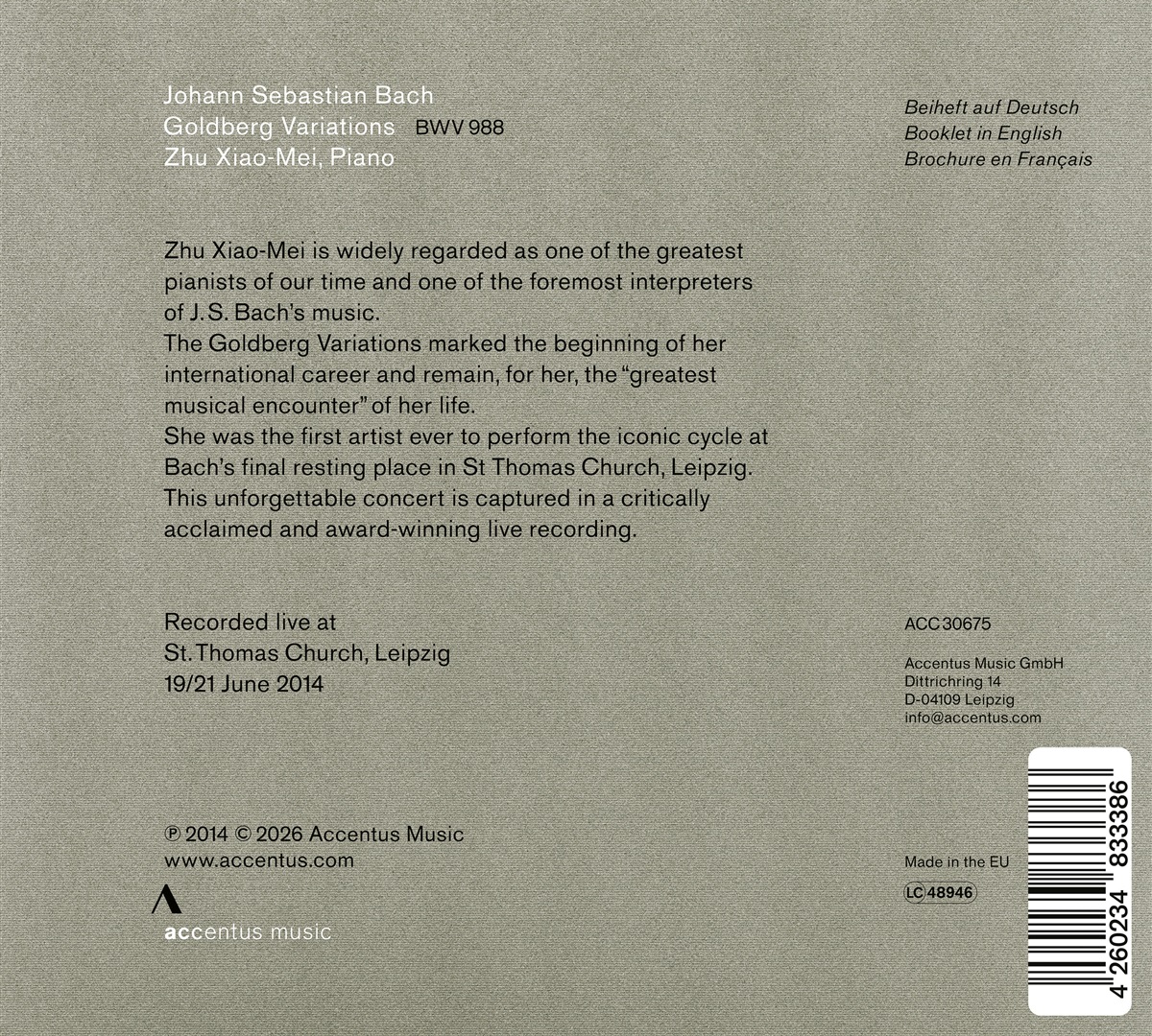 Zhu Xiao-Mei gilt weithin als eine der herausragendsten Pianistinnen unserer Zeit und als eine der bedeutendsten Interpretinnen der Musik Johann Sebastian Bachs. Die Goldberg-Variationen markierten den Beginn ihrer internationalen Karriere und sind für sie bis heute die ‚größte musikalische Begegnung’ ihres Lebens. Als erste Künstlerin überhaupt führte sie diesen ikonischen Zyklus an Bachs letzter Ruhestätte, der Thomaskirche in Leipzig, auf. Dieses unvergessliche Konzert ist in einer von der Kritik gefeierten und preisgekrönten Live-Aufnahme festgehalten.