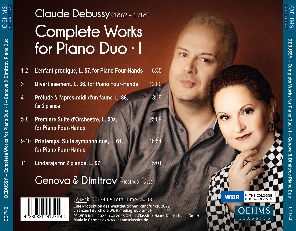 Das international gefeierte Genova & Dimitrov Piano Duo begeht 2025 sein 30-jähriges Bühnenjubiläum – ein Meilenstein in einer Karriere, die von zahlreichen Preisen und hochgelobten Einspielungen geprägt ist. Zum Jubiläum präsentieren die Pianisten ein außergewöhnliches Projekt: die Gesamteinspielung aller Werke für Klavierduo von Claude Debussy in drei Volumina und debütiert damit bei OehmsClassics. Dabei erklingen sowohl berühmte Werke als auch selten gespielte Schätze, darunter meisterhafte Bearbeitungen von Orchesterkompositionen wie das atmosphärische „Prélude à l’après-midi d’un faune“. Die Produktion entstand in Zusammenarbeit mit dem WDR und verspricht ein faszinierendes Klangerlebnis für Liebhaber impressionistischer Musik.