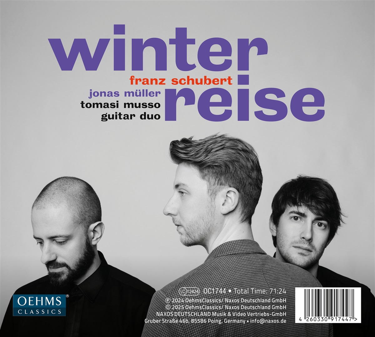 Im vorliegende Debut-Album haben der Bariton Jonas Müller und das Tomasi Musso Guitar Duo Franz Schuberts „Winterreise“ eingespielt. Die Bearbeitung für zwei Gitarren schafft eine besondere neue dreidimensionale, kammermusikalische Konstellation, die gewiss vom Sänger eine veränderte Einstellung zum Singen einfordert, die eher nach innen nimmt, was das Klavier heraustriebe. Das kommt auf besondere Weise dem Gedanken entgegen, dass die „Winterreise“ nicht einfach die ausgedachten Lieder eines reisenden Waldhornisten sind, sondern dass aus der existentiellen Begegnung des Fremden mit dem Leiermann neue, vorher nie gehörte und nur gemeinsam zu singende Lieder erklingen. Der international gefragter Konzertsänger Jonas Müller sang bereits mit dem Gewandhausorchester, dem Rundfunkorchester des WDR und der Münchner Klangverwaltung. Als Solist in Oratorien stand er neben Sängerkollegen wie Ian Bostridge, Simon Keenlyside, Michael Schade und Daniel Behle auf der Bühne. Die italienischen Gitarristen Davide Giovanni Tomasi und Marco Musso arbeiten seit 2016 als Duo zusammen, das weltweit gefragt ist. Auch in dieser Saison bringen Konzertreisen die beiden in verschiedene europäische Länder, nach Mexico, in die USA und nach Japan.