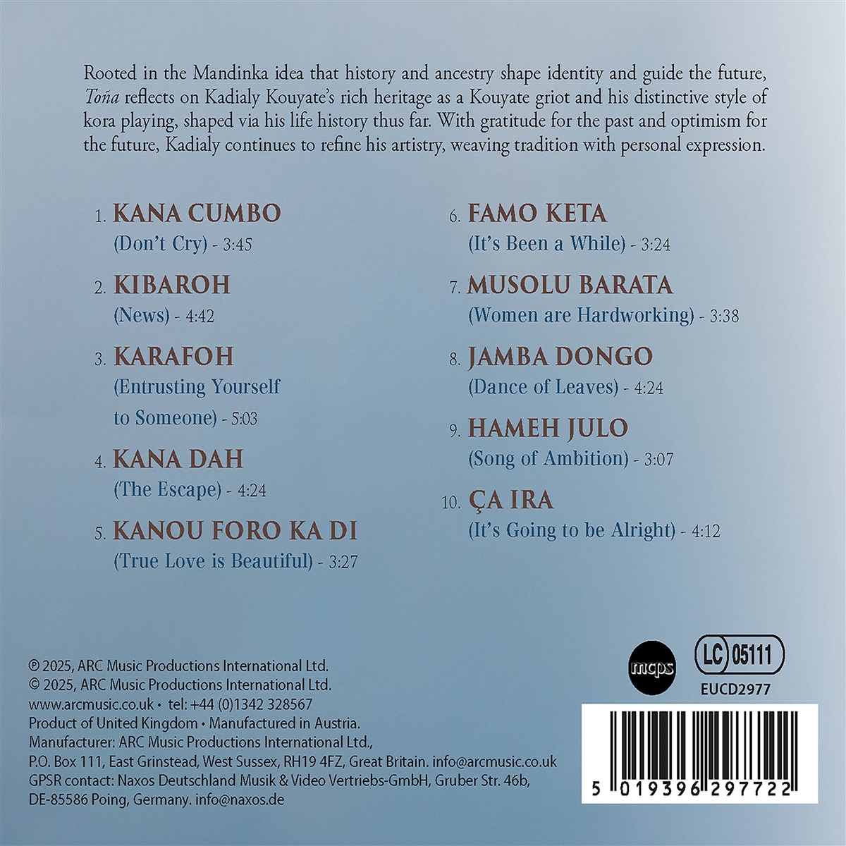 Mit seinem Album Toña taucht der Musiker Kadialy Kouyate in die reiche Kultur seiner Heimatregion ein und verwebt persönliche Erfahrungen mit den tiefen Traditionen der Kultur des Mandinka-Volks. Dichter, Schriftsteller und Sänger in Personalunion werden in verschiedenen westafrikanischen Ländern als „Griot“ bezeichnet, Kadialy Kouyate zählt zu diesen besonders begabten Künstlern. Begleitet von einem außergewöhnlichen Ensemble, zu dem Davide Mantovani, Josh Middleton, Mina Mikhael Salama, Al MacSween und andere gehören, erschafft Kadialy Kouyate auf Toña eine fesselnde Klanglandschaft, die sein unverwechselbares Spiel auf der westafrikanischen Stegharfe Kora hervorhebt. Toña ist eine persönliche Reise mit Wiegenliedern, herzlichen Huldigungen an die Liebe und kraftvollen Erzählungen über Migration, Widerstandsfähigkeit und Tradition. Verwurzelt in der Mandinka-Idee, dass Geschichte und Abstammung die Identität formen und die Zukunft leiten, reflektiert Toña Kadialy Kouyates reiches Erbe als Kouyate-Griot und seinen unverwechselbaren Stil des Kora-Spiels, der durch seine bisherige Lebensgeschichte geprägt wurde.