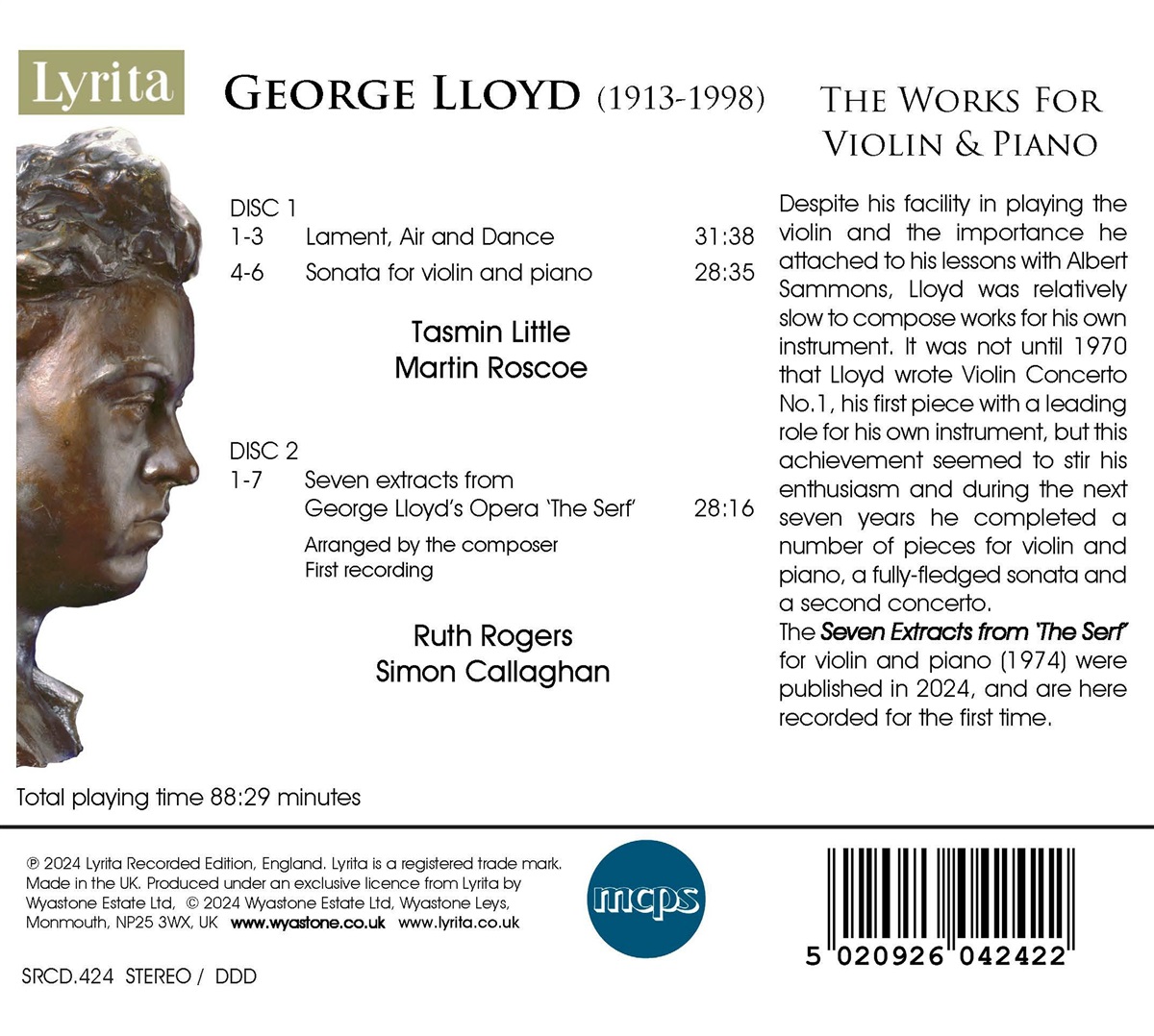 George Lloyd begann im Alter von fünf Jahren mit dem Geigenunterricht und war sechs Jahre lang Schüler des Geigers Albert Sammons. Wenn er auf seine prägenden Einflüsse zurückblickt, hebt Lloyd Sammons als denjenigen hervor, der den nachhaltigsten Einfluss auf seine aufkeimende Kreativität hatte, und führt Sammons' „instinktives, freies, ausdrucksstarkes Spiel“ als direkten Einfluss auf die Art von Musik an, die er zu schreiben begann. In diesem Zusammenhang passt Lloyds Beschreibung des Klangs von Sammons' Spiel als „schön“, mit „einer lyrischen Qualität“, in der „jede Note zu singen schien“, zur lyrischen Herangehensweise des Komponisten an musikalische Linien und Phrasen. Trotz seiner Leichtigkeit im Geigenspiel und der Bedeutung, die er dem Unterricht bei Albert Sammons beimaß, begann Lloyd erst relativ spät, Werke für sein eigenes Instrument zu komponieren. Erst 1970 schrieb Lloyd das Violinkonzert Nr. 1, sein erstes Stück mit einer Hauptrolle für sein eigenes Instrument, aber diese Leistung schien seine Begeisterung zu wecken, und in den nächsten sieben Jahren vollendete er eine Reihe von Stücken für Violine. Die sieben Auszüge aus „The Serf“ für Violine und Klavier (1974) wurden 2024 veröffentlicht und sind hier erstmals aufgenommen.