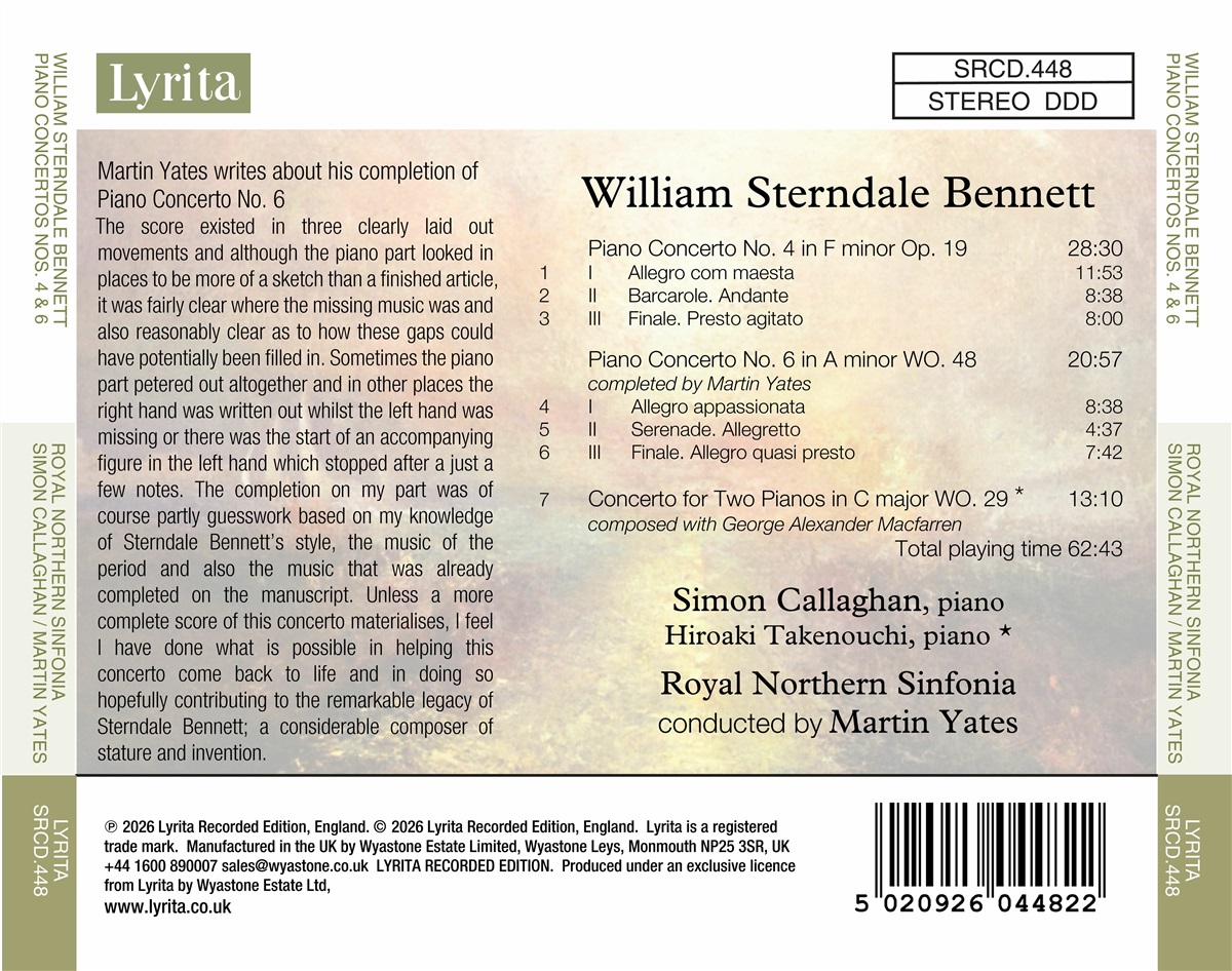William Sterndale Bennett war in England und Deutschland als herausragender Pianist anerkannt, und seine besten und für ihn typischsten Kompositionen schrieb er für sein eigenes Instrument. Neben zahlreichen Werken für Soloklavier, darunter zwei Sonaten, komponierte er sechs Klavierkonzerte und ein einteiliges Caprice für Klavier und Orchester. Er führte alle seine Werke für Klavier und Orchester öffentlich auf, wobei er selbst als Solist fungierte. Während eines Besuchs bei seinen Freunden in Leipzig von Januar bis März 1842 erwähnte Bennett in einem Brief, dass er an einem neuen Konzert arbeite, das er vor seiner Abreise nach London aufführen wolle. Dazu kam es zwar nicht, aber zu diesem Zeitpunkt muss bereits ein Großteil der Arbeit an dem später unveröffentlichten Klavierkonzert Nr. 6 in a-Moll, WoO 48, geleistet worden sein. Bennett arbeitete im Sommer 1843 weiter an dem Konzert und hoffte, es veröffentlichen zu können, doch es kam immer wieder zu weiteren Verzögerungen. Martin Yates, der in dieser Aufnahme die Royal Northern Sinfonia dirigiert, komplettierte das unvollendete Werk auf der Grundlage seiner Kenntnisse über den Stil von Sterndale Bennett, die Musik der damaligen Zeit und auch die bereits fertiggestellte Musik im Manuskript. Das Konzert für zwei Klaviere in C-Dur, WoO. 29, eigentlich ein einziger Satz, wurde im Frühjahr 1835 als Gemeinschaftswerk von Bennett und seinem Kommilitonen an der RAM, George Alexander Macfarren, komponiert. Bennett und Macfarren waren die führenden Kompositionsstudenten ihres Jahrgangs und so beschlossen die beiden Pianisten, gemeinsam ein Konzert für zwei Klaviere und Orchester zu komponieren und dann mit ihren Kommilitonen aufzuführen. Die Komposition eines Doppelklavierkonzerts war keine Studienanforderung, sondern diente vielmehr ihrem Vergnügen. Die beiden Männer begannen abwechselnd: Bennett komponierte die ersten siebenunddreißig Takte, Macfarren die nächsten fünfzig und so weiter, wobei die letzten etwa 125 Takte offenbar eine Zusammenarbeit waren.