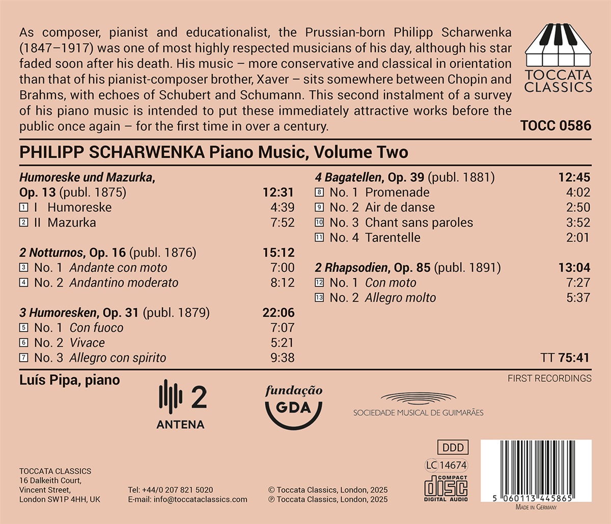 Als Komponist, Pianist und Pädagoge war der in Preußen geborene Philipp Scharwenka (1847–1917) einer der angesehensten Musiker seiner Zeit, auch wenn sein Stern bald nach seinem Tod verblasste. Seine Musik – konservativer und klassischer orientiert als die seines Bruder, des Pianisten und Komponisten Xaver – bewegt sich irgendwo zwischen Chopin und Brahms, mit Anklängen an Schubert und Schumann. Diese zweite Folge einer Übersicht über seine Klaviermusik soll diese unmittelbar ansprechenden Werke erneut der Öffentlichkeit zugänglich machen – zum ersten Mal seit über einem Jahrhundert. Der portugiesische Pianist Luís Pipa tritt regelmäßig in Solokonzerten, als Mitglied von Kammermusikgruppen oder als Solist mit verschiedenen Orchestern auf. Er ist außerdem Komponist von Klavierstücken, Kammermusik und Liedern sowie Autor zahlreicher pädagogischer und wissenschaftlicher Veröffentlichungen zum Thema Klavier.
