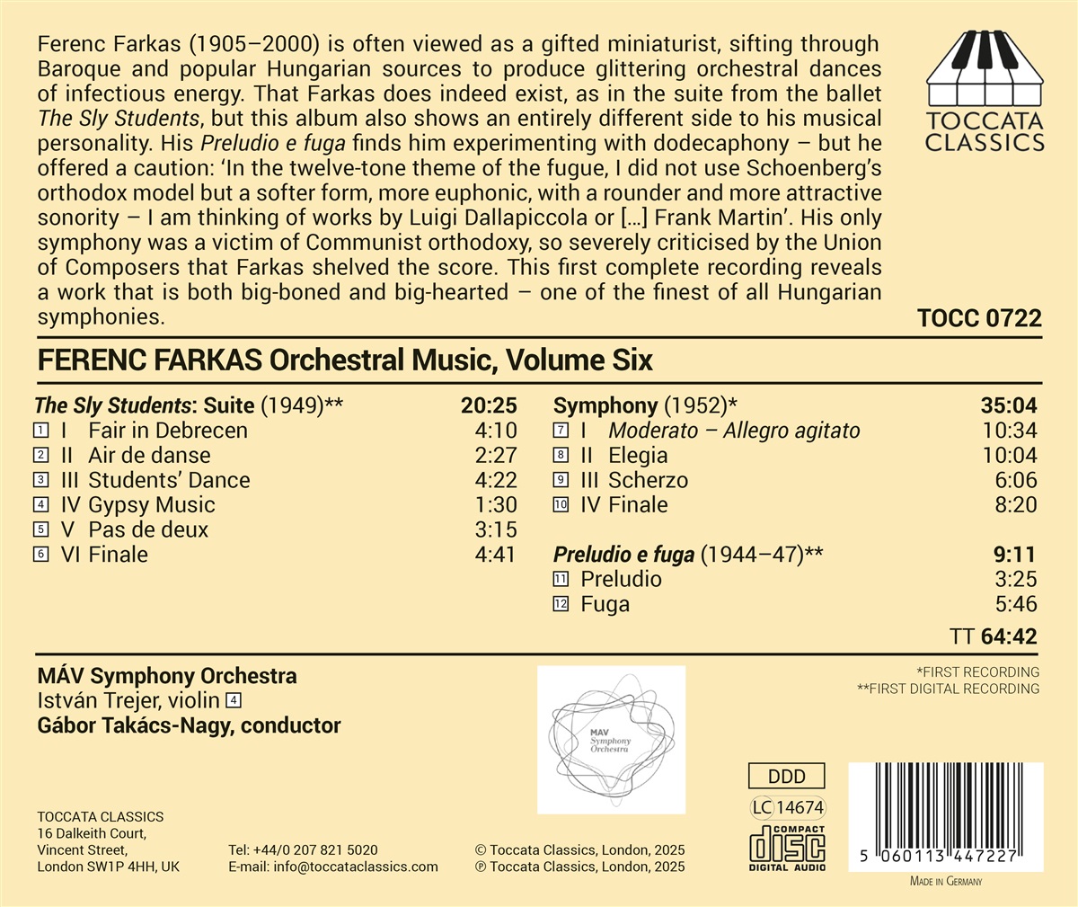 Ferenc Farkas (1905–2000) wird oft als begnadeter Miniaturist angesehen, der barocke und populäre ungarische Quellen durchforstete, um daraus glanzvolle Orchestertänze von mitreißender Energie zu schaffen. Diesen Farkas präsentiert die Suite aus dem Ballett „Die schlauen Studenten“, doch dieses Album zeigt auch eine ganz andere Seite seiner musikalischen Persönlichkeit. In seinem „Preludio e fuga“ experimentiert er mit Zwölftonmusik – allerdings mit einer Einschränkung: ‚Im Zwölfton-Thema der Fuge habe ich nicht Schönbergs orthodoxes Modell verwendet, sondern eine weichere, euphonischere Form mit einer runderen und attraktiveren Klangfülle – ich denke dabei an Werke von Luigi Dallapiccola oder […] Frank Martin.‘ Seine einzige Sinfonie fiel der kommunistischen Orthodoxie zum Opfer und wurde bei Versammlungen der Komponistenunion so heftig kritisiert, dass Farkas die Partitur zu den Akten legte. Diese erste vollständige Aufnahme offenbart ein Werk, das sowohl groß angelegt als auch großherzig ist – eine der schönsten ungarischen Sinfonien überhaupt. Dieses Album folgt auf Aufnahmen von Farkas Orchesterwerken, Kammermusik-Stücken, Musik für Blasinstrumente und Chormusik. Der bekannte Dirient Gábor Takács-Nagy leitet das MÁV Symphony Orchestra.