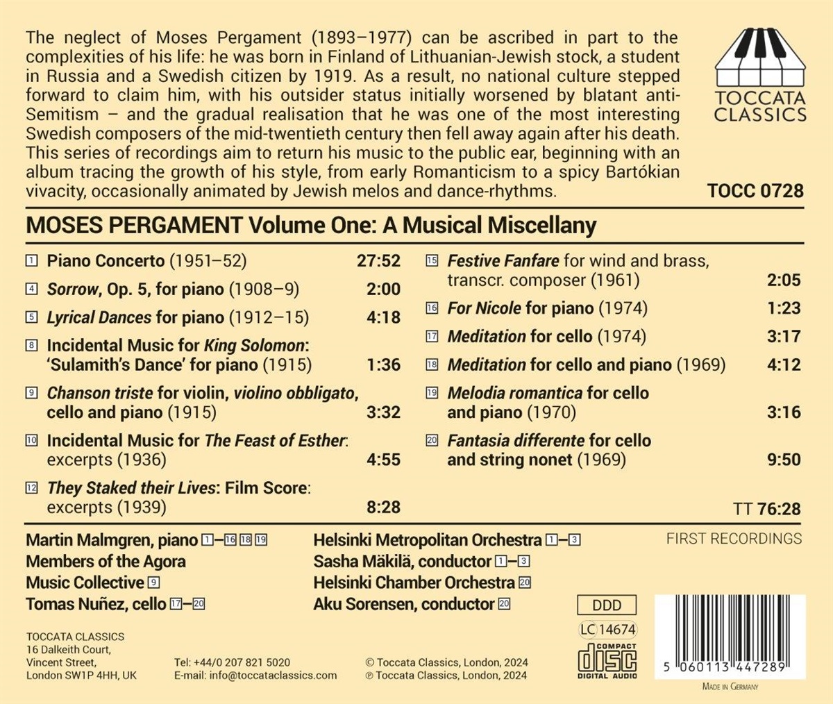 Die Vernachlässigung von Moses Pergament (1893–1977) lässt sich zum Teil auf die Komplexität seines Lebens zurückführen: Er wurde in Finnland als Kind litauisch-jüdischer Eltern geboren, studierte in Russland und war ab 1919 schwedischer Staatsbürger. Daher beanspruchte ihn keine nationale Kultur für sich, und sein Außenseiterstatus wurde zunächst durch unverhohlenen Antisemitismus noch verschärft. Die allmähliche Anerkennung, die er als einer der interessantesten schwedischen Komponisten der Mitte des 20. Jahrhunderts erfuhr, schwand nach seinem Tod wieder. Diese Reihe von Aufnahmen soll seine Musik wieder ins öffentliche Bewusstsein rücken, beginnend mit einem Album, das die Entwicklung seines Stils von der Frühromantik bis hin zu einer prägnanten, an Bartók erinnernden Lebhaftigkeit nachzeichnet, die gelegentlich von jüdischem Melos und Tanzrhythmen belebt wird.
