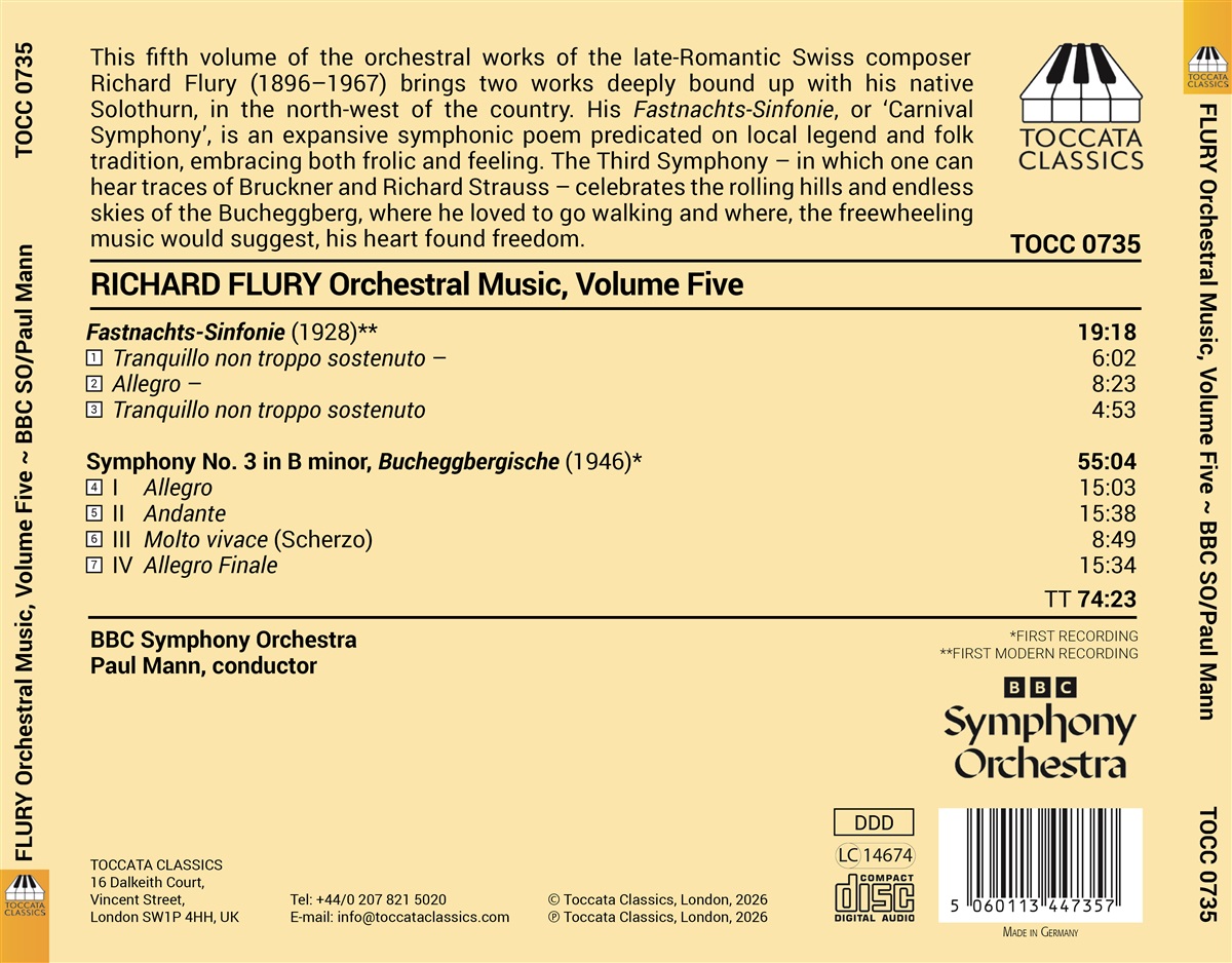 Der fünfte Teil der Orchesterwerke des spätromantischen Schweizer Komponisten Richard Flury (1896–1967) enthält zwei Werke, die eng mit seiner Heimatstadt Solothurn im Nordwesten des Landes verbunden sind. Seine „Fastnachts-Sinfonie“ ist eine ausladende sinfonische Tondichtung, die auf lokalen Legenden und Volkstraditionen basiert und sowohl Ausgelassenheit als auch tief empfundenes Gefühl zum Ausdruck bringt. Die Dritte Symphonie – in der man Spuren von Anton Bruckner und Richard Strauss erkennen kann – feiert die sanften Hügel und den endlosen Himmel des Bucheggbergs, wo er gerne spazieren ging und wo, wie die unbeschwerte Musik vermuten lässt, sein Herz Freiheit fand. Paul Mann dirigiert das BBC Symphony Orchestra, das nicht zuletzt wegen der BBC Proms in der Royal Albert Hall berühmt ist. Paul Mann ist häufiger Gastdirigent vieler Orchester in Europa, den USA, Australien und im Fernen Osten. Seine Tätigkeit als Chefdirigent des Odense Sinfonie-Orchesters in Dänemark war von großen Erfolgen bei Kritik und Publikum begleitet, insbesondere in den Sinfonien Ludwig van Beethovens, Edward Elgars, Gustav Mahlers, Robert Schumanns und Dmitri Schostakowitschs. In jüngster Zeit war Paul Mann entscheidend involviert in die Wiederentdeckung des Schweizer Komponisten Richard Flury, indem er alle nummerierten Sinfonien und weitere sinfonische Werke sowie drei der vier Flury-Opern einspielte, zum Teil mit eigenen Instrumentationen von Raritäten. Er fertigte auch den Notensatz an, wie oft im Zusammenhang mit seinen Aufnahmen.