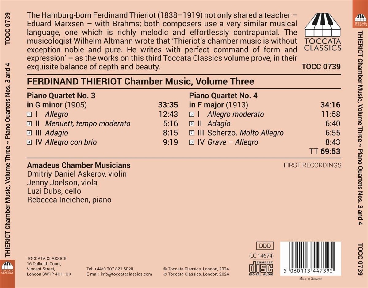 Der in Hamburg geborene Ferdinand Thieriot (1838-1919) teilte nicht nur einen Lehrer - Eduard Marxsen - mit Brahms, beide Komponisten verwenden auch eine sehr ähnliche musikalische Sprache, die reich an Melodien und ohne Mühe kontrapunktisch ist. Der Musikwissenschaftler Wilhelm Altmann schrieb, dass „Thieriots Kammermusik ausnahmslos edel und rein ist. Er schreibt mit perfekter Beherrschung von Form und Ausdruck“, wie die Werke in diesem dritten Teil der Thieriot-Reihe auf Toccata Classics in ihrer exquisiten Balance von Tiefe und Schönheit beweisen.