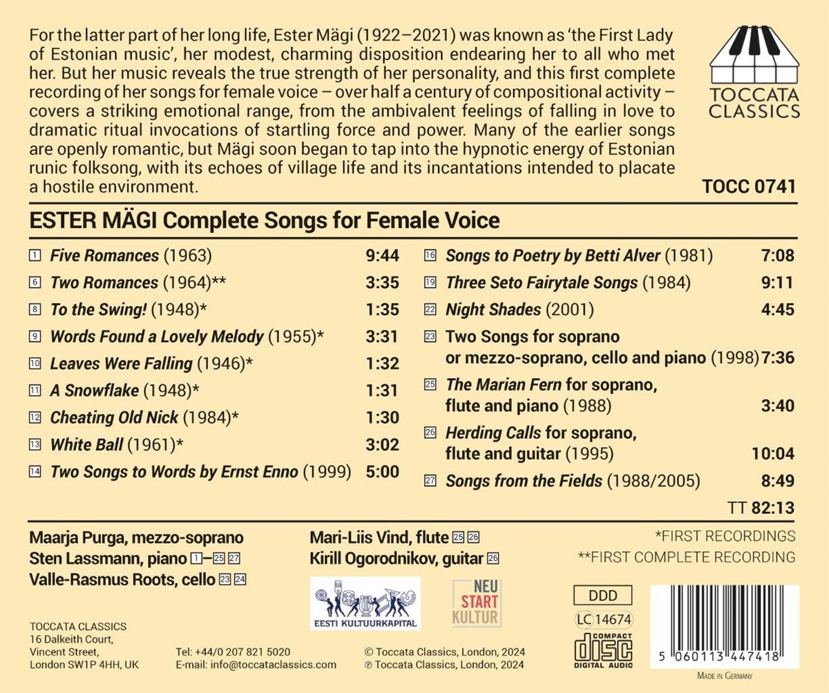 In der zweiten Hälfte ihres langen Lebens war Ester Mägi (1922–2021) als „First Lady der estnischen Musik“ bekannt. Ihre bescheidene, charmante Art machte sie bei allen Menschen beliebt, die sie trafen. In ihrer Musik offenbart sich jedoch die wahre Stärke ihrer Persönlichkeit, und diese erste vollständige Aufnahme ihrer Lieder für Frauenstimme – aus über einem halben Jahrhundert kompositorischer Tätigkeit – deckt eine beeindruckende emotionale Bandbreite ab, von den ambivalenten Gefühlen des Verliebens bis hin zu dramatischen rituellen Anrufungen von verblüffender Kraft und Stärke. Viele der früheren Lieder sind offen romantisch, aber Mägi begann bald, die hypnotische Energie der estnischen Runenlieder zu nutzen, die an das Dorfleben erinnern und mit denen eine feindliche Umgebung besänftigt werden sollte.