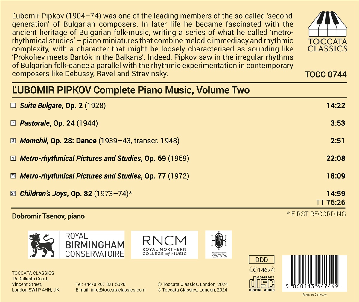 Ľubomir Pipkov (1904-74) war einer der führenden Vertreter der sogenannten ,zweiten Generation' der bulgarischen Komponisten. In seinem späteren Leben war er vom alten Erbe der bulgarischen Volksmusik fasziniert und schuf eine Reihe von sogenannten, ‚metrorhythmischen Studien‘: Klavierminiaturen, die melodische Unmittelbarkeit und rhythmische Komplexität mit einem Charakter verbinden, den man grob mit ‚Prokofjew trifft Bartók auf dem Balkan umschreiben könnte. In der Tat sah Pipkov in den unregelmäßigen Rhythmen des bulgarischen Volkstanzes eine Parallele zu den rhythmischen Experimenten zeitgenössischer Komponisten wie Debussy, Ravel und Strawinski. Diese Veröffentlichung enthält die „Suite Bulgare“ op. 2, die „Metro-rhythmical Pictures and Studies“ op. 69 & 77, die unvollendeten „Children's Joys“ op. 82 und mehrere Miniaturen.