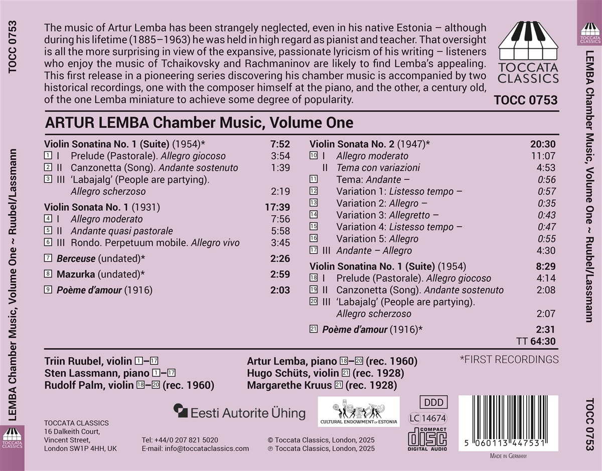Die Musik von Artur Lemba wurde seltsamerweise selbst in seiner Heimat Estland wenig beachtet – obwohl er zu Lebzeiten (1885–1963) als Pianist und Lehrer hoch geschätzt war. Diese Vernachlässigung ist umso überraschender angesichts seiner leidenschaftlichen und lyrischen Werke: Anhänger der Musik von Tschaikowski und Rachmaninow werden Lembas Musik wahrscheinlich ansprechend finden. Diese erste Veröffentlichung einer wegweisenden Reihe zur Entdeckung seiner Kammermusik wird von zwei historischen Aufnahmen begleitet, eine mit dem Komponisten selbst am Klavier und die andere, eine hundert Jahre alte Aufnahme der einzigen Miniatur Lembas, die eine gewisse Popularität erlangte. Zu hören ist Triin Ruubel, eine estnische Geigerin, die weltweit als Solistin und Kammermusikerin auftritt. Seit April 2015 ist sie Konzertmeisterin des Estonian National Symphony Orchestra. Sten Lassmann tritt seit dem Gewinn des ersten Preises beim Sechsten Estnischen Klavierwettbewerb 2002 international als Solist und Kammermusiker auf.