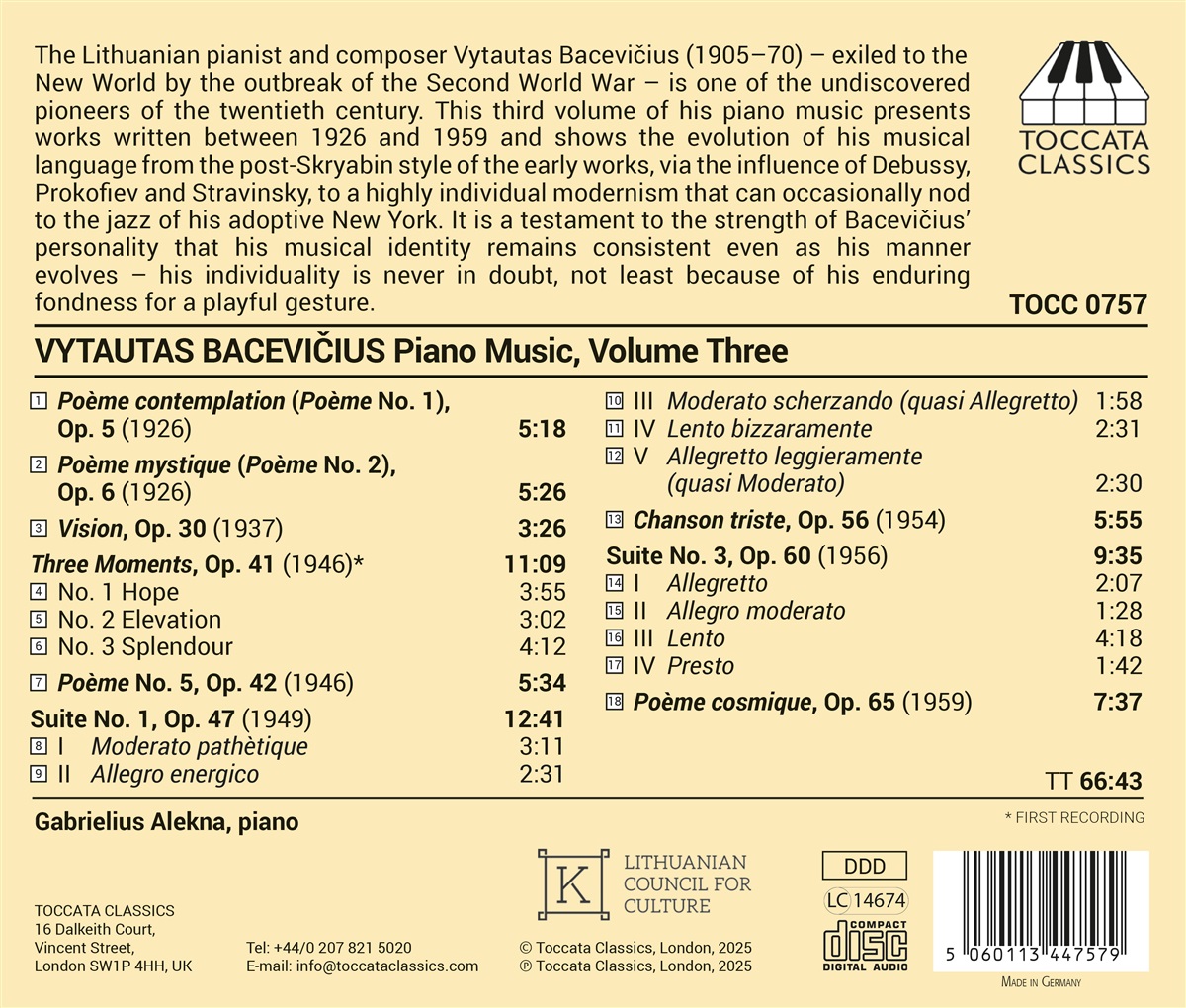 Der litauische Pianist und Komponist Vytautas Bacevičius (1905–1970), der anlässlich des Ausbruchs des Zweiten Weltkriegs in die Neue Welt auswanderte, ist einer der unentdeckten Pioniere des 20. Jahrhunderts. Der dritte Teil seiner Klavierwerke umfasst Kompositionen aus den Jahren 1926 bis 1959 und zeigt die Entwicklung seiner musikalischen Sprache vom post-alexander-skryabinischen Stil der frühen Werke über den Einfluss von Claude Debussy, Sergei Prokofjew und Igor Strawinsky zu einem höchst individuellen Modernismus, der gelegentlich Anklänge an den Jazz seiner Wahlheimat New York erkennen lässt. Es zeugt von der Stärke Bacevičius' Persönlichkeit, dass seine musikalische Identität auch bei der Weiterentwicklung seines Stils konsistent bleibt – seine Individualität steht nie in Frage, nicht zuletzt wegen seiner anhaltenden Vorliebe für spielerische Gesten. Auch Pianist Gabrielius Alekna stammt aus Litauen und er spielte bereits gemeinsam mit wichtigen internationalen Klangkörpern wie dem Radio-Symphonieorchester Wien (RSO Wien), dem Juilliard Orchestra, dem New Amsterdam und dem Adelphi Symphony Orchestra (New York) und mit fast allen bedeutenden Orchestern und Ensembles Litauens.