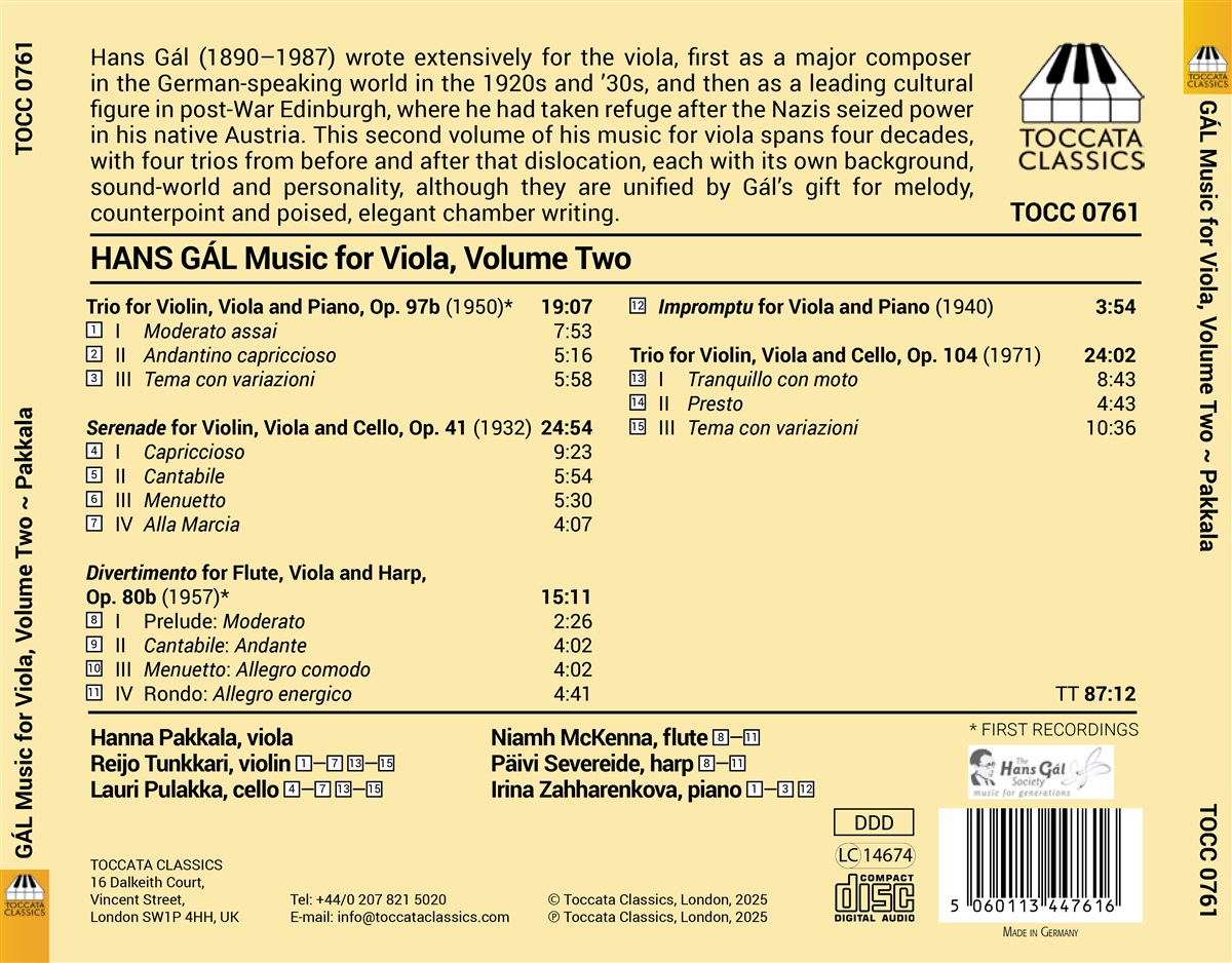Als bedeutender Komponist im deutschsprachigen Raum in den 1920er und 30er Jahren und als führende kulturelle Persönlichkeit im Edinburgh der Nachkriegszeit, wohin er nach der Machtergreifung der Nazis in seinem Heimatland Österreich geflüchtet war, schrieb Hans Gál zahlreiche Werke für die Bratsche. Die auf diesem Album zusammengefassten Werke entstanden in einer Zeitspanne von rund vier Jahrzehnten, mit vier Trios aus der Zeit vor und nach dieser wohnlichen und kulturellen Zäsur, jedes mit seinem eigenen Hintergrund, seiner Klangwelt und seiner Persönlichkeit, obwohl sie durch Gáls Begabung für Melodie, Kontrapunkt und ausgewogene, elegante Kammermusik vereint sind. Dies ist der zweite Teil einer Reihe mit Gáls kompletter Musik für Bratsche.