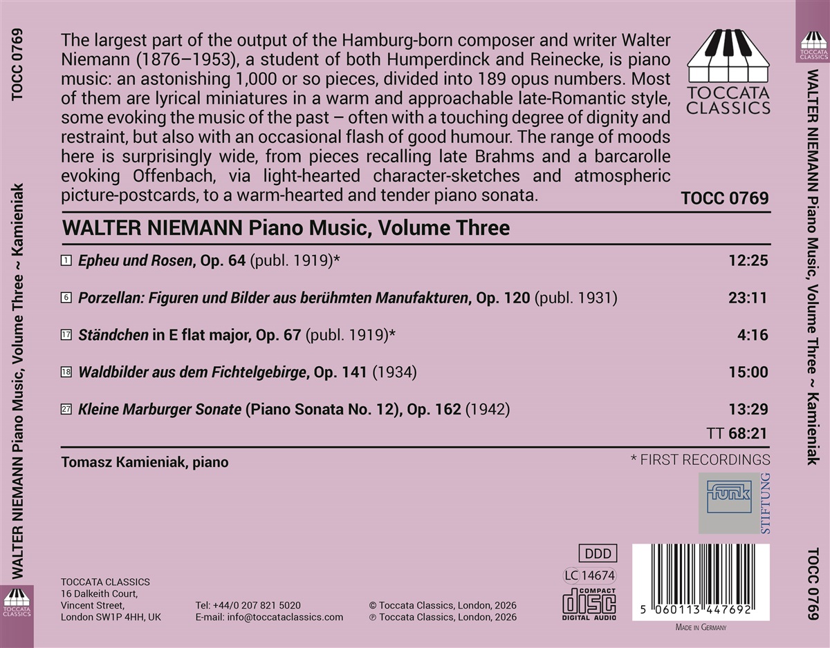 Der größte Teil des Schaffens des in Hamburg geborenen Komponisten und Schriftstellers Walter Niemann (1876–1953), einem Schüler von Engelbert Humperdinck und Carl Reinecke, besteht aus Klaviermusik: erstaunliche rund 1.000 Stücke, unterteilt in 189 Opusnummern. Die meisten davon sind lyrische Miniaturen in einem warmen und zugänglichen spätromantischen Stil, von denen einige an die Musik der Vergangenheit erinnern – oft mit einer berührenden Würde und Zurückhaltung, aber auch mit gelegentlichen Anflügen von Humor. Die Bandbreite der Stimmungen ist hier überraschend groß, von Stücken, die an den späten Johannes Brahms erinnern, und einer Barkarole, die an Jacques Offenbach erinnert, über heitere Charakterskizzen und stimmungsvolle Postkarten bis hin zu einer warmherzigen und zarten Klaviersonate. Tomasz Kamieniak ist der Pianist dieser Aufnahme. Er studierte an der Musikakademie Katowice und der Hochschule für Musik Franz Liszt Weimar. Dort erhielt er auch den Spezialpreis beim 4. Internationalen Franz-Liszt-Wettbewerb und durfte Werke von Józef Wieniawski aufnehmen. Er tritt international auf und ist auch als Komponist erfolgreich.