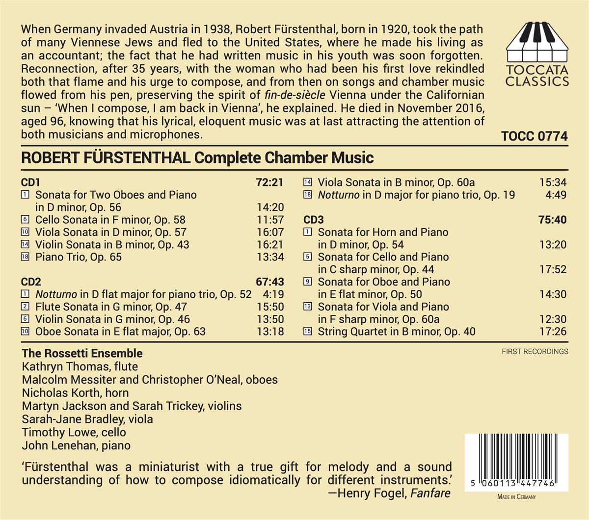 Als Deutschland 1938 Österreich überfiel, schlug Robert Fürstenthal, geboren 1920, den Weg vieler Wiener Juden ein und floh in die Vereinigten Staaten, wo er seinen Lebensunterhalt als Buchhalter verdiente. Dass er in seiner Jugend Musik geschrieben hatte, geriet bald in Vergessenheit. Die Wiederbegegnung mit seiner ersten Liebe nach 35 Jahren entfachte sowohl diese Flamme als auch seinen Drang zu komponieren, und von da an flossen Lieder und Kammermusik aus seiner Feder, die den Geist des Fin de Siècle in Wien unter der kalifornischen Sonne bewahrten – ‚Wenn ich komponiere, bin ich wieder in Wien‘, erklärte er. Er starb im November 2016 im Alter von 96 Jahren, in dem Wissen, dass seine lyrische, ausdrucksstarke Musik endlich die Aufmerksamkeit von Musikern und Mikrofonen auf sich zog. Erstmals ist mit diesem Dreifach-Album eine Gesamtausgabe der Kammermusik von Robert Fürstenthal erhältlich. Es spielt das Rossetti Ensemble, bestehend aus Sara Trickey, Sarah-Jane Bradley, Tim Lowe und John Lenehan, allesamt angesehene Musikerinnen und Musiker.