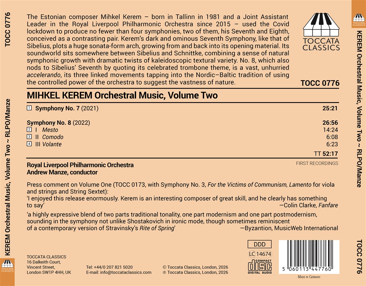 Der estnische Komponist Mihkel Kerem – 1981 in Tallinn geboren und seit 2015 erster Geiger im Royal Liverpool Philharmonic Orchestra – nutzte den Covid-Lockdown, um nicht weniger als vier Sinfonien zu komponieren, von denen zwei, seine Siebte und Achte, als kontrastreiches Paar konzipiert sind. Kerems düstere und bedrohliche Siebte Sinfonie zeichnet, ähnlich wie die von Sibelius, einen riesigen Bogen in Sonatenform, der aus dem Anfangsmaterial erwächst und wieder in dieses zurückkehrt. Ihre Klangwelt liegt irgendwo zwischen Sibelius und Schnittke und verbindet ein Gefühl natürlichen sinfonischen Wachstums mit dramatischen Wendungen und einer kaleidoskopischen Vielfalt an Texturen. Die Nr. 8, die ebenfalls auf Sibelius' Siebte anspielt, indem sie deren berühmtes Posaunenthema zitiert, ist ein gewaltiges, gemächliches Accelerando, dessen drei miteinander verbundene Sätze an die nordisch-baltische Tradition anknüpfen, die kontrollierte Kraft des Orchesters zu nutzen, um die Weite der Natur zu suggerieren. Es spielt das Royal Liverpool Philharmonic Orchestra unter der Leitung von Andrew Manze, fast ein Jahrzehnt lang Chefdirigent der NDR Radiophilharmonie in Hannover.