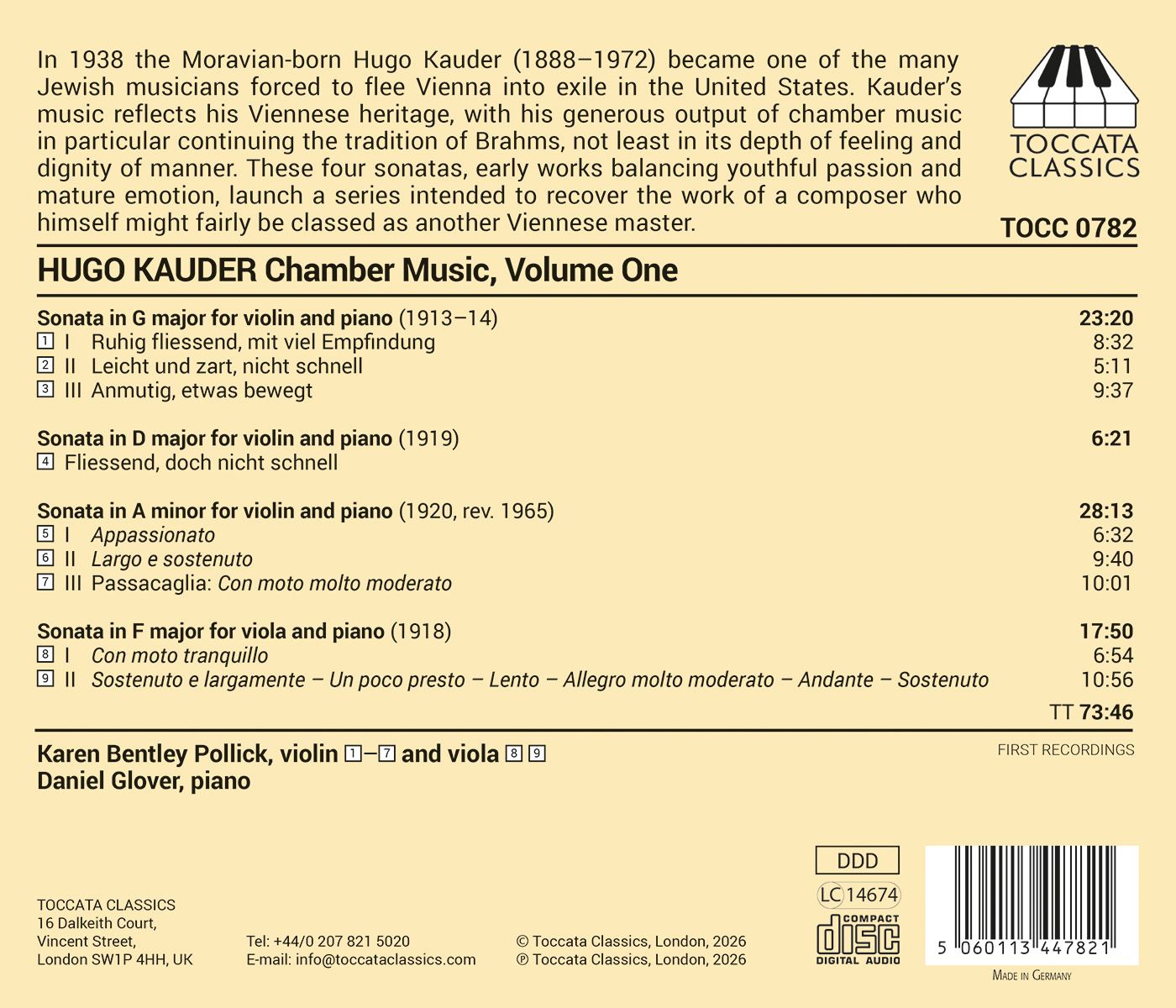 Der in Mähren geborene Hugo Kauder (1888-1972) gehörte 1938 zu den vielen jüdischen Musikern, die aus Wien ins amerikanische Exil fliehen mussten. In Kauders Musik spiegelt sich sein Wiener Erbe wider, wobei sein großzügiges kammermusikalisches Schaffen vor allem die Tradition von Brahms fortsetzt, nicht zuletzt in seiner Gefühlstiefe und Würde. Diese vier Sonaten, frühe Werke, in denen sich jugendliche Leidenschaft und reife Emotionen die Waage halten, bilden den Auftakt zu einer Reihe, die das Werk eines Komponisten wiederentdecken soll, der selbst mit Fug und Recht als ein weiterer Wiener Meister bezeichnet werden kann. Karen Bentley Pollick spielt Violine und Bratsche, Daniel Glover ist am Klavier zu hören. Bentley Pollick gehört zu den führenden US-amerikanischen Musikerinnen und beherrscht nicht nur die Geige, Bratsche und norwegische Hardanger Fiddle sondern ist auch eine versierte Pianistin. Ihre Bandbreite deckt vom Barock bis zu zeitgenössischer Musik viele Stilrichtungen ab. Glover gehört ebenfalls zu den Großen der USA, er hat dort fast in allen Bundesstaaten Auftritte absolviert, ebenso wie in 25 weiteren Ländern der Welt.