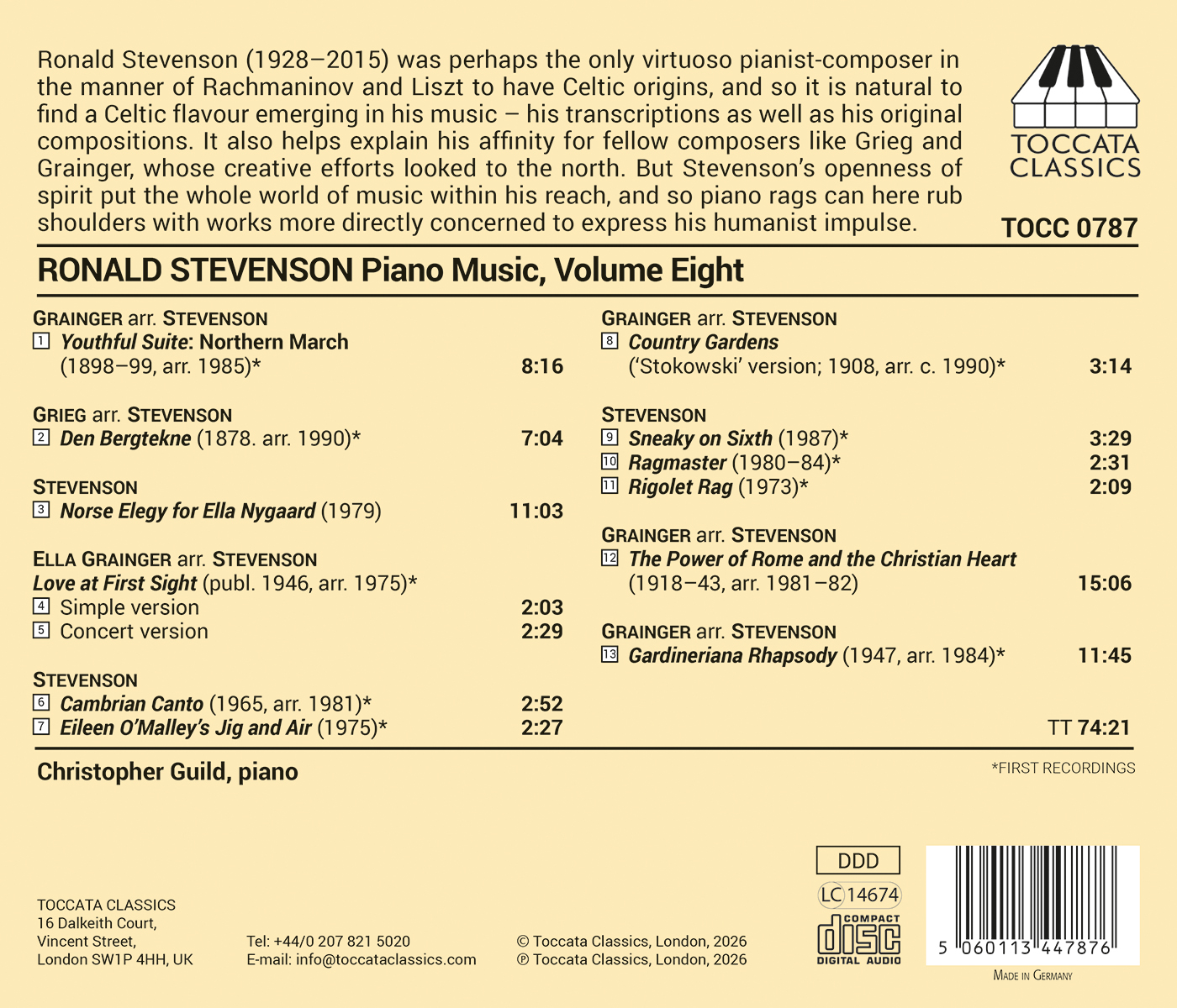 Ronald Stevenson (1928-2015) war vielleicht der einzige virtuose Klavierkomponist nach Art von Sergei Rachmaninow und Franz Liszt, der keltische Wurzeln hatte, und so ist es nur natürlich, dass sich in seiner Musik – sowohl in seinen Transkriptionen als auch in seinen Originalkompositionen – ein keltisches Flair zeigt. Dies erklärt auch seine Affinität zu Komponistenkollegen wie Edvard Grieg und Percy Grainger, deren Schaffen sich nach Norden richtete. Doch Stevensons Offenheit brachte die ganze Welt der Musik in seine Reichweite, und so finden sich hier neben Klavierstücken auch Werke, die seinen humanistischen Impetus direkter zum Ausdruck bringen. Christopher Guild ist der Pianist auf diesem Album. Guild ist immer wieder als Solist, als Kammermusiker und Ensemble-Musiker auf Tournee. Neben der Musik von Bernard van Dieren, Ronald Center und William Brocklesby Wordsworth hat er sich vor allem auf Ronald Stevenson spezialisiert.