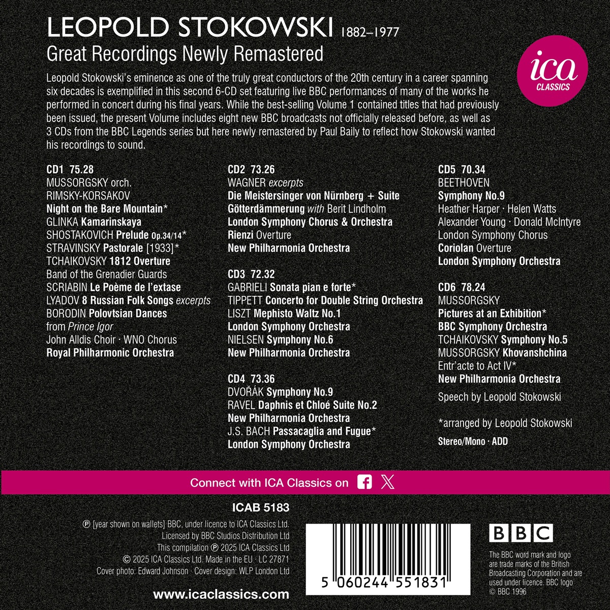 Mit diesem zweiten 6-CD-Set, das zahlreiche Werke enthält, die Leopold Stokowski in seinen letzten Lebensjahren live bei der BBC aufführte, wird seine herausragende Stellung als einer der ganz großen Dirigenten des 20. Jahrhundert dokumentiert. Während die erfolgreiche erste Folge Titel enthielt, die bereits zuvor veröffentlicht worden waren, enthält der vorliegende zweite Teil acht neue BBC- Aufnahmen, die bisher nicht offiziell veröffentlicht wurden, sowie drei CDs aus der BBC Legends-Serie, die von Paul Baily neu gemastert wurden, um den von Stokowski gewünschten Klang seiner Aufnahmen wiederherzustellen.