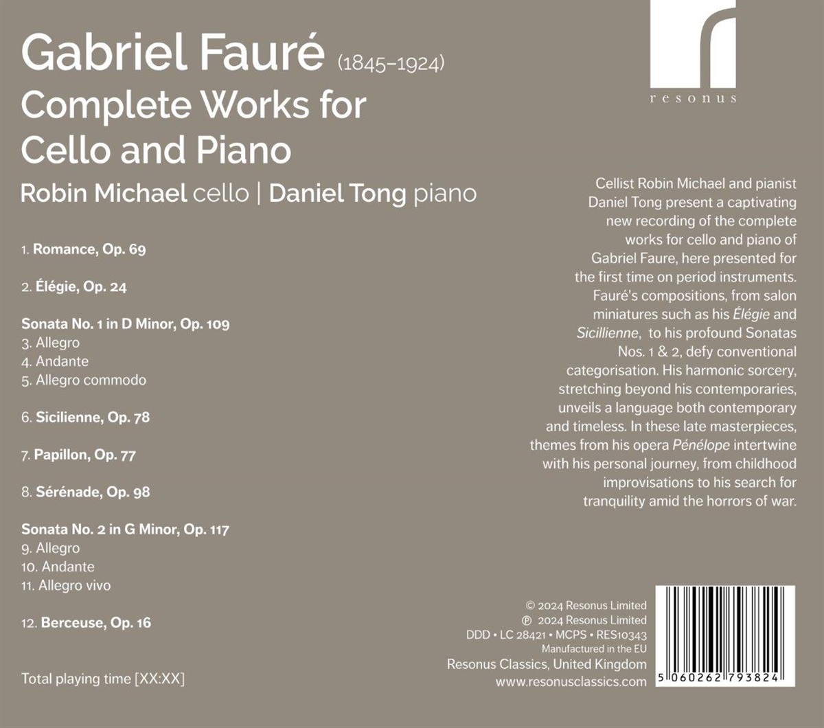 Der Cellist Robin Michael und der Pianist Daniel Tong präsentieren eine fesselnde neue Aufnahme des Gesamtwerks für Cello und Klavier von Gabriel Fauré, das hier erstmals auf historischen Instrumenten zu hören ist. Faurés Kompositionen, von Salonminiaturen wie seiner „Élégie“ und „Sicillienne“ bis hin zu seinen tiefgründigen Sonaten Nr. 1 und 2, entziehen sich einer konventionellen Kategorisierung. Seine harmonische Zauberei, die über die seiner Zeitgenossen hinausgeht, offenbart eine Sprache, die sowohl zeitgenössisch als auch zeitlos ist. In diesen späten Meisterwerken verflechten sich Themen aus seiner Oper „Pénélope“ mit seiner eigenen Lebensgeschichte, von Improvisationen aus der Kindheit bis hin zu seiner Suche nach Ruhe inmitten der Schrecken des Krieges.