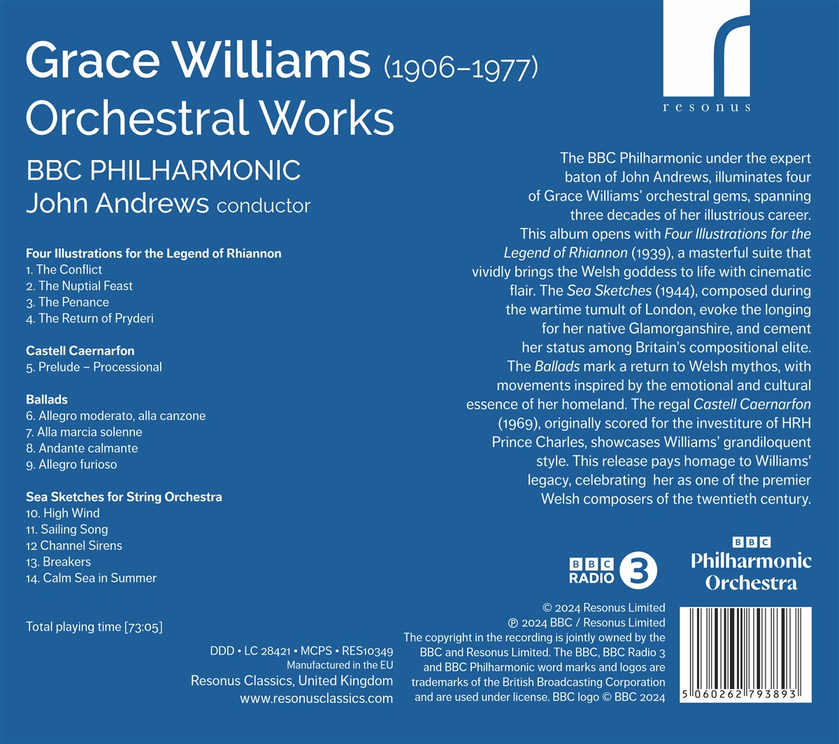 Das BBC Philharmonic Orchestra unter der fachkundigen Leitung von John Andrews beleuchtet vier der Orchesterjuwelen von Grace Williams, die aus drei Jahrzehnte ihrer glanzvollen Karriere stammen. Dieses Album beginnt mit „Four Illustrations of the Legend of Rhiannon“ (1939), einer meisterhaften Suite, die die walisische Göttin mit filmischem Flair lebendig werden lässt. „The Sea Sketches“ (1944), komponiert während der Kriegswirren in London, wecken die Sehnsucht nach ihrer Heimatstadt Barry in Glamorgan und festigen ihren Status in der britischen Kompositionselite. Die Balladen markieren eine Rückkehr zum walisischen Mythos, mit Sätzen, die von der emotionalen und kulturellen Essenz ihrer Heimat inspiriert sind. Das majestätische „Castell Caernarfon“ (1969), ursprünglich für die Amtseinführung von Prinz Charles komponiert, zeigt Williams' grandiosen Stil. Diese Veröffentlichung ist eine Hommage an Williams' Vermächtnis und feiert sie als eine der führenden walisischen Komponistinnen des 20. Jahrhunderts.