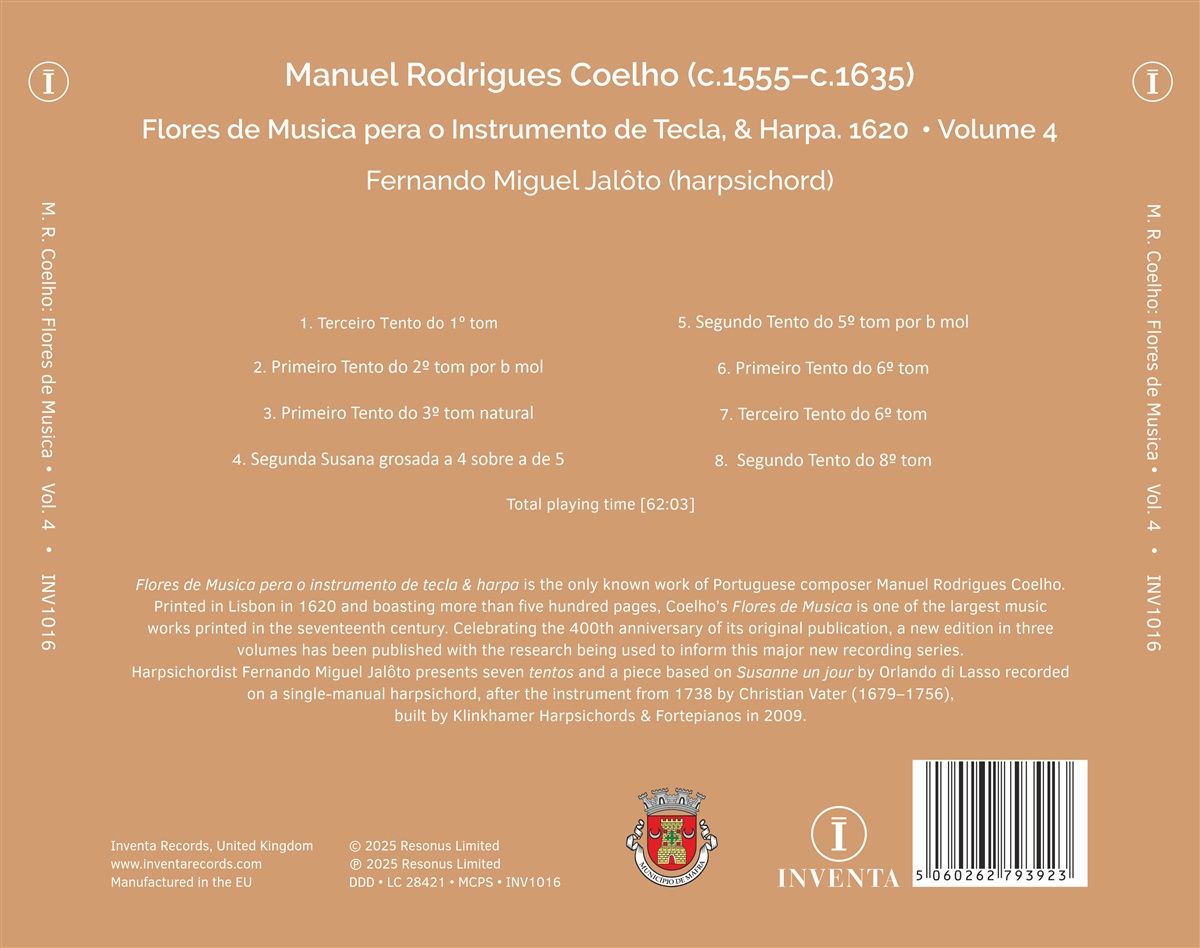 In Band 4 der Sammlung „Flores de Musica pera o instrumento de tecla & harpa“ von Manuel Rodrigues Coelho präsentiert der Cembalist Fernando Miguel Jalôto sieben Tentos und ein Stück, das auf „Susanne un jour“ von Orlando di Lasso basiert. Die Stücke wurden auf einem einmanualigen Cembalo eingespielt, das dem Instrument von Christian Vater (1679–1756) aus dem Jahr 1738 nachempfunden ist und 2009 von Klinkhamer Harpsichords & Fortepianos gebaut wurde. Coelhos „Flores de Musica“ wurde 1620 in Lissabon gedruckt und ist mit mehr als fünfhundert Seiten eines der umfangreichsten Musikwerke, die im 17. Jahrhundert herausgegeben wurden. Die Reihe feiert den 400. Jahrestag der Erstveröffentlichung des Werks und berücksichtigt aktuelle Forschungsergebnisse. Fernando Miguel Jalôto ist Spezialist für historische Tasteninstrumente. Sein Solorepertoire für Orgel konzentriert sich hauptsächlich auf die iberische und italienische Schule vom 16. bis 18. Jahrhundert, und als Cembalo-Solist spielt er oft französische, deutsche und englische Musik aus derselben Zeit.