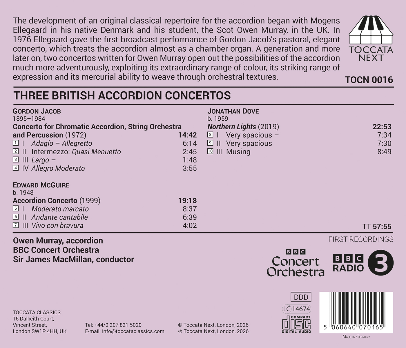 Die Entwicklung eines originellen klassischen Repertoires für das Akkordeon begann mit Mogens Ellegaard in seiner Heimat Dänemark und seinem Schüler, dem Schotten Owen Murray, in Großbritannien. 1976 spielte Ellegaard zum ersten Mal in einer Radiosendung das pastorale, elegante Konzert von Gordon Jacob, das das Akkordeon fast wie eine Kammerorgel behandelt. Die beiden Konzerte, die eine Generation später für Owen Murray geschrieben wurden, eröffnen viel abenteuerlichere Möglichkeiten für das Akkordeon, indem sie dessen außergewöhnliche Klangfarbe, seinen beeindruckenden Ausdrucksbereich und seine Fähigkeit, sich geschmeidig durch orchestrale Texturen zu schlängeln, voll ausnutzen. Der schottische Akkordeonist Owen Murray nahm schon im Alter von 16 Jahren erfolgreich an britischen Akkordeon-Wettkämpfen teil. Später studierte er am Kongelige Danske Musikkonservatorium in Kopenhagen und spielte dann sowohl im Vereinigten Königreich als auch im Ausland. Seit 1986 leitet er den Lehrstuhl für klassisches Akkordeon an der Royal Academy of Music in London. Sir James MacMillan dirigiert das BBC Concert Orchestra.