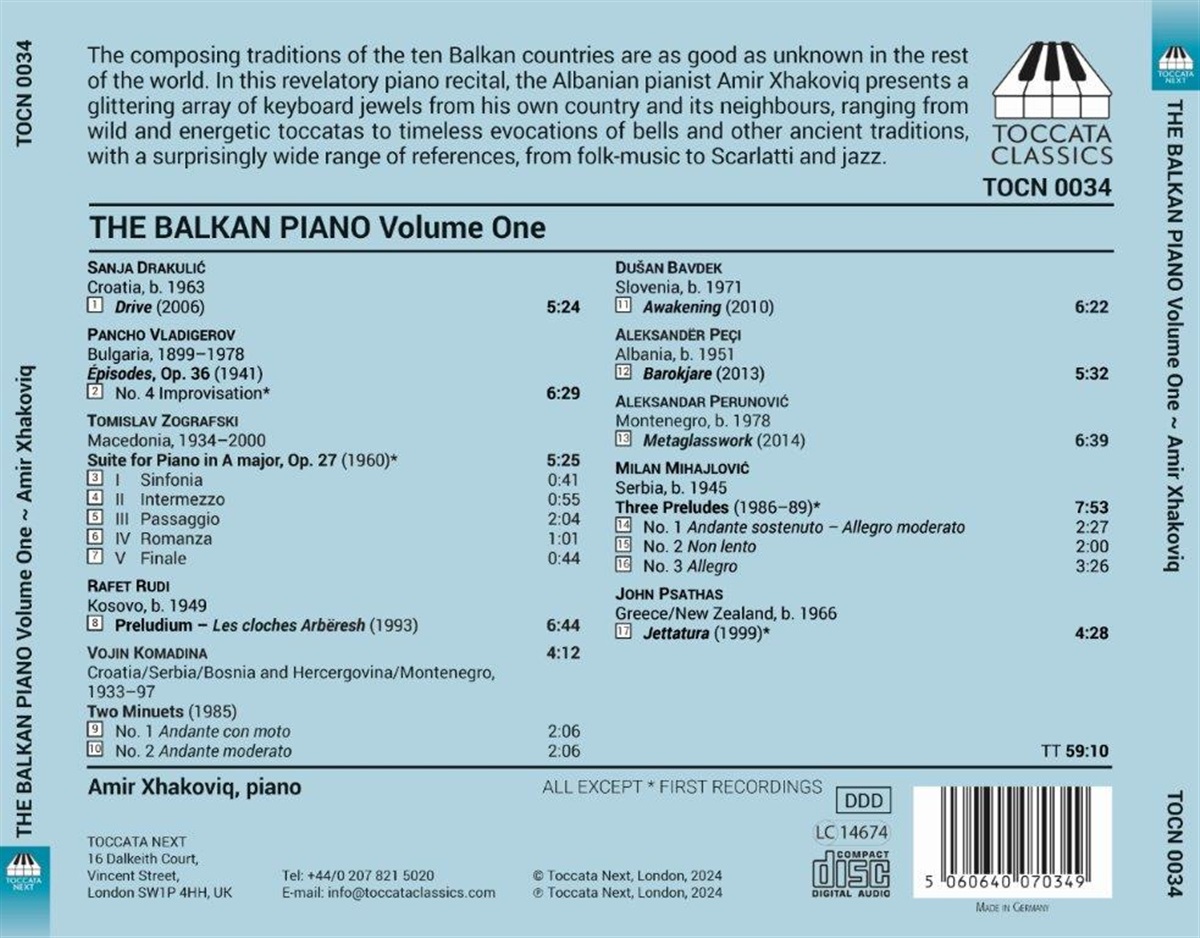 Die Kompositionstraditionen der Länder des Balkans sind im Rest der Welt so gut wie unbekannt. In seinem Klavierkonzert präsentiert der albanische Pianist Amir Xhakoviq eine schillernde Auswahl an Klavierjuwelen aus seinem Land und dessen Nachbarländern, die von wilden und energiegeladenen Toccaten bis hin zu zeitlosen Beschwörungen von Glocken und anderen alten Traditionen reichen und eine überraschend große Bandbreite an Referenzen aufweisen, von Volksmusik über Scarlatti bis hin zu Jazz.