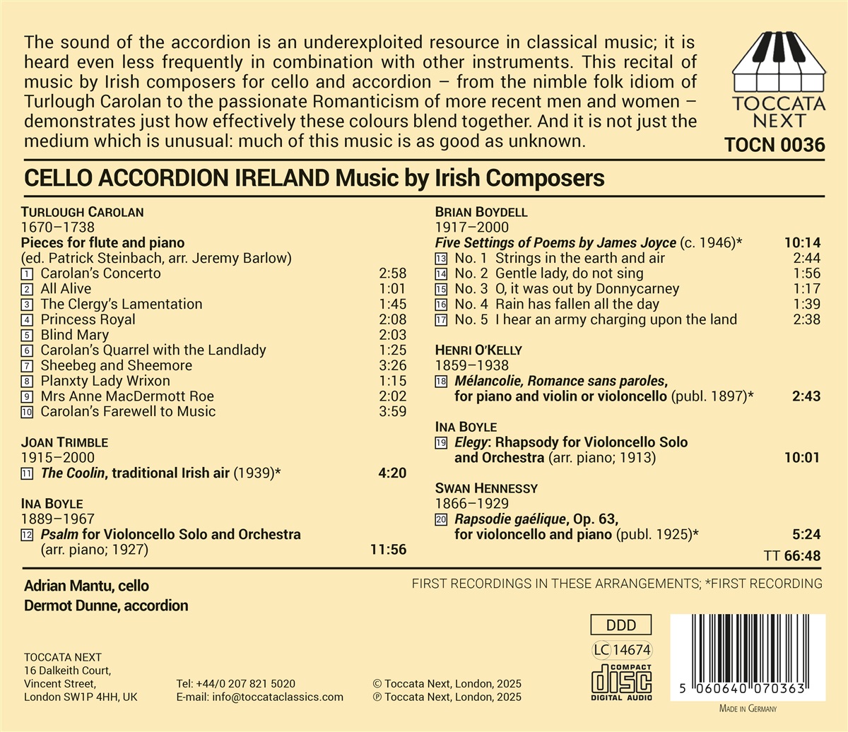 Der Klang des Akkordeons ist in der klassischen Musik eine wenig genutzte Ressource; noch seltener ist er in Kombination mit anderen Instrumenten zu hören. Dieses Recital mit Musik irischer Komponisten für Cello und Akkordeon - von der flinken Folkmusik Turlough Carolans bis zur leidenschaftlichen Romantik neuerer Komponisten und Komponistinnen - zeigt, wie gut diese Klangarben zusammenpassen. Und nicht nur das Medium ist ungewöhnlich: Ein Großteil dieser Musik ist so gut wie unbekannt.