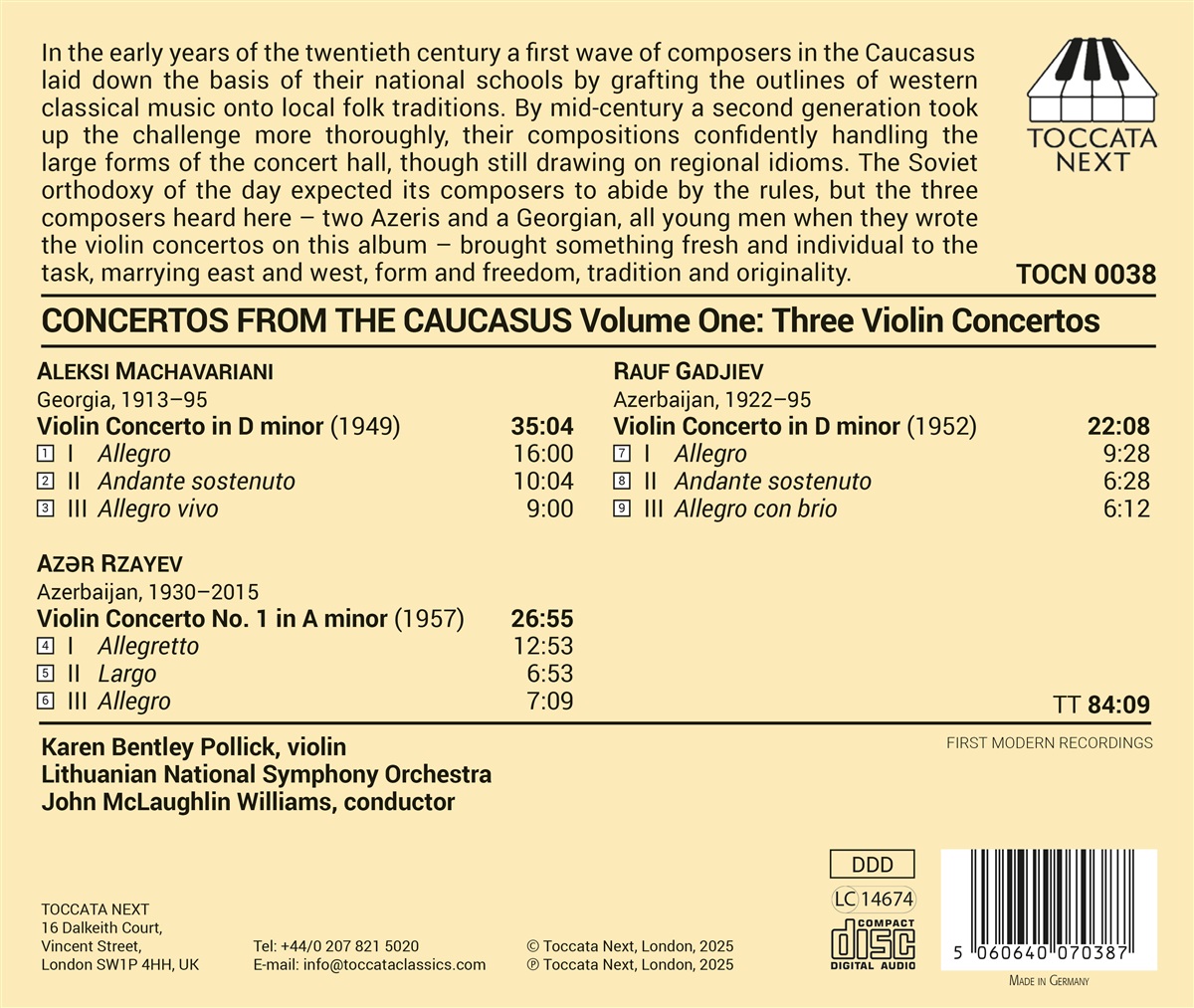 In den ersten Jahren des 20. Jahrhunderts legte eine erste Welle von Komponisten im Kaukasus die Grundlage für ihre nationalen Schulen, indem sie die Umrisse der westlichen klassischen Musik auf die lokalen Volkstraditionen übertrugen. Um die Jahrhundertmitte nahm eine zweite Generation die Herausforderung gründlicher an, deren Kompositionen selbstbewusst mit den großen Formen des Konzertsaals umgingen, obwohl sie immer noch auf regionale Idiome zurückgriffen. Die damalige sowjetische Orthodoxie erwartete von ihren Komponisten, dass sie sich an die Regeln hielten, aber die drei hier zu hörenden Komponisten - zwei Aseris und ein Georgier, allesamt junge Männer, als sie die Violinkonzerte auf diesem Album schrieben - brachten etwas Frisches und Individuelles in diese Aufgabe ein, indem sie Ost und West, Form und Freiheit, Tradition und Originalität miteinander verbanden.
