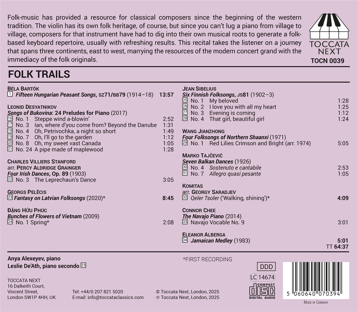 Die Volksmusik ist seit den Anfängen der westlichen Tradition eine Quelle für klassische Komponisten. Die Violine zum Beispiel hat ihr eigenes volkstümliches Erbe, aber da man ein Klavier nicht von Dorf zu Dorf schleppen kann, mussten Komponisten für dieses Instrument in ihren eigenen musikalischen Wurzeln graben, um ein volkstümliches Tastenrepertoire zu schaffen, meist mit erfrischenden Ergebnissen. Dieses Album nimmt den Zuhörer mit auf eine Reise über drei Kontinente, von Ost nach West, und verbindet die Möglichkeiten des modernen Konzertflügels mit der Unmittelbarkeit der volkstümlichen Originale.
