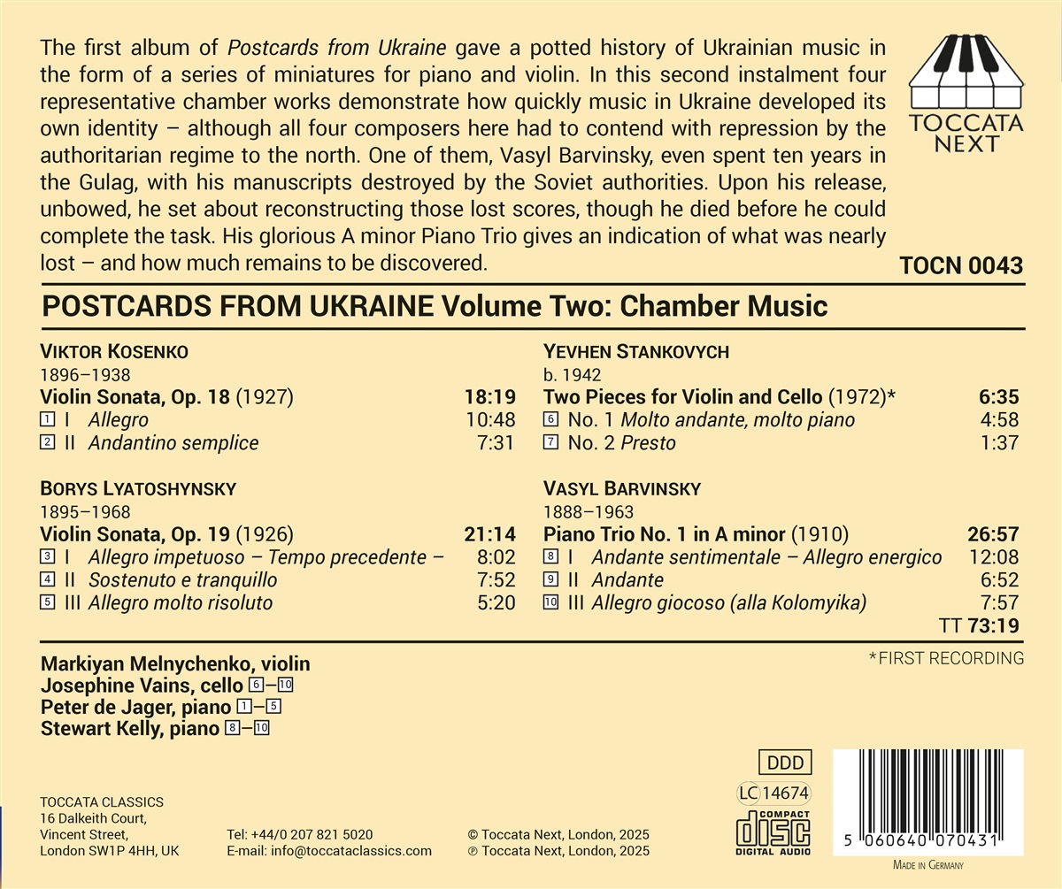Das erste Album der Reihe „Postcards from Ukraine“ gab einen kurzen Überblick über die Geschichte der ukrainischen Musik mittels einiger Miniaturen für Klavier und Violine. In diesem zweiten Teil zeigen vier repräsentative Kammermusikwerke, wie schnell die Musik in der Ukraine eine eigene Identität entwickelte – obwohl alle vier Komponisten hier mit der Unterdrückung durch das autoritäre Regime im Norden zu kämpfen hatten. Einer von ihnen, Vasyl Barvinsky, verbrachte sogar zehn Jahre im Gulag, und seine Manuskripte wurden von den sowjetischen Behörden vernichtet. Nach seiner Freilassung – ungebrochen – machte er sich daran, die verlorenen Partituren zu rekonstruieren, starb jedoch, bevor er diese Aufgabe vollenden konnte. Sein glorreiches „Klaviertrio in a-Moll“ gibt einen Eindruck davon, was beinahe verloren gegangen wäre – und wie viel es noch zu entdecken gibt.