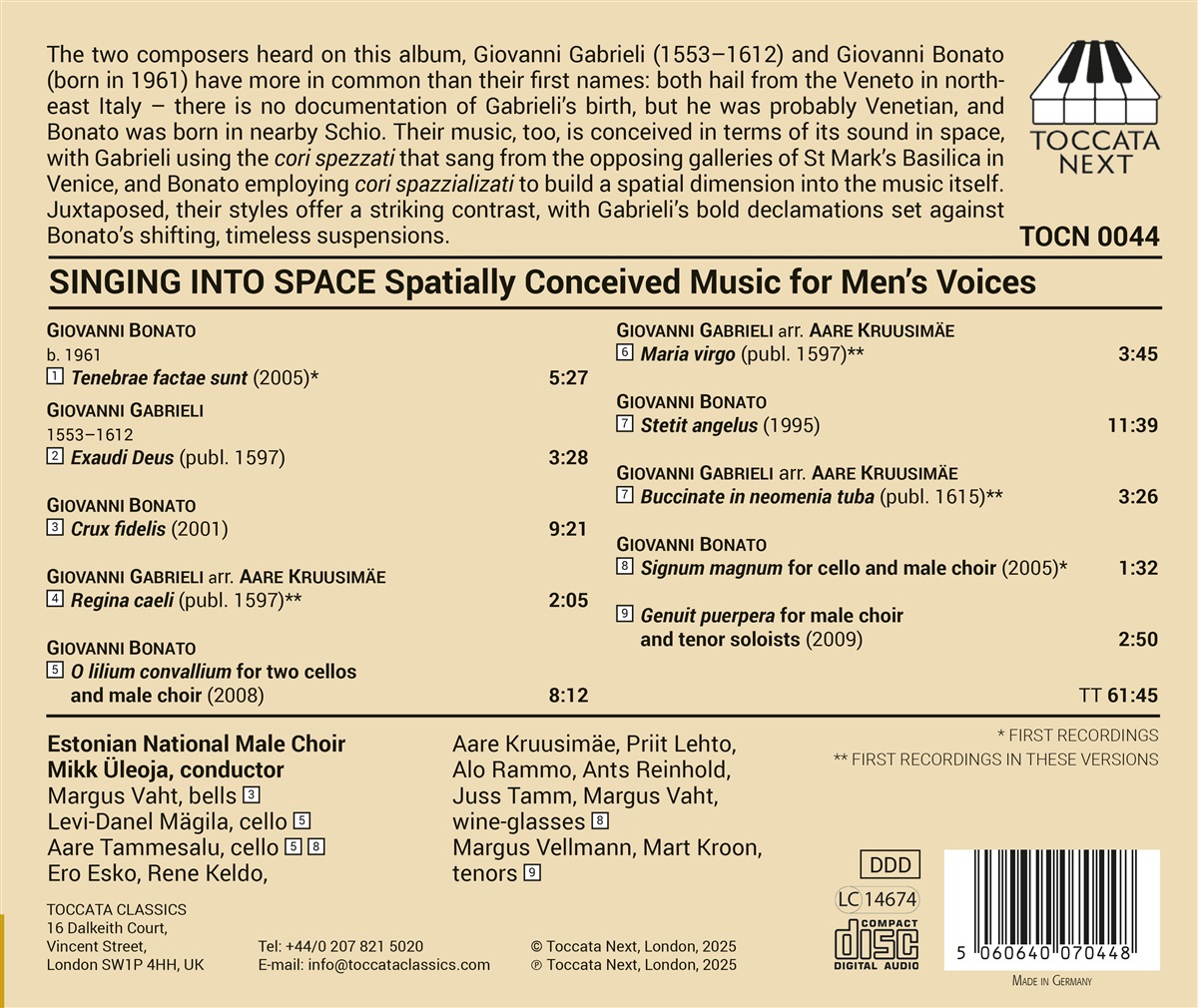 Die beiden Komponisten, die auf diesem Album zu hören sind, Giovanni Gabrieli (1553–1612) und Giovanni Bonato (* 1961), haben mehr gemeinsam als nur ihren Vornamen: Beide stammen aus Venetien im Nordosten Italiens – über Gabriellis Geburt gibt es keine Aufzeichnungen, aber er war wahrscheinlich Venezianer, und Bonato wurde im nahe gelegenen Schio geboren. Auch ihre Musik hat Ähnlichkeiten: Sie ist auf den Klang im Raum ausgerichtet. Gabrieli nutzte die Cori spezzati, die aus den gegenüberliegenden Emporen der Markuskirche in Venedig sangen, und Bonato setzte Cori spazzializati ein, um der Musik selbst eine räumliche Dimension zu verleihen. Im Nebeneinander bieten ihre Stile einen auffälligen Kontrast: Gabriellis kühne Deklamationen stehen Bonatos wechselnden, zeitlosen Suspensionen gegenüber. Der Estonian National Male Choir ist einer der weltweit größten professionellen Männer-Chöre und besteht bereits seit 1944. Er erhielt einen Grammy und zahlreiche weitere Auszeichnungen.