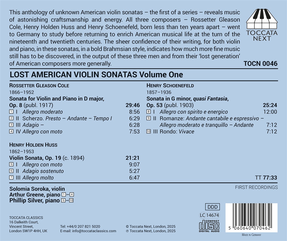Diese Anthologie unbekannter amerikanischer Violinsonaten – die erste einer Reihe – offenbart Musik von erstaunlicher Kunstfertigkeit und Energie. Alle drei Komponisten – Rossetter Gleason Cole, Henry Holden Huss und Henry Schoenefeld, die weniger als zehn Jahre auseinander geboren wurden – gingen zum Studium nach Deutschland, bevor sie zurückkehrten, um das amerikanische Musikleben an der Wende vom 19. zum 20. Jahrhundert zu bereichern. Die schiere Selbstsicherheit ihrer Kompositionen für Violine und Klavier in diesen Sonaten, die in einem kühnen Brahms-Stil gehalten sind, zeigt, wie viel großartige Musik noch entdeckt werden muss, sowohl im Schaffen dieser drei Männer als auch in dem ihrer ‚verlorenen Generation‘ amerikanischer Komponisten im Allgemeinen.